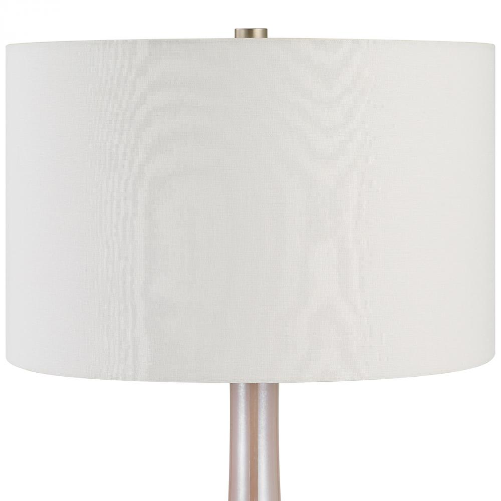 Elegant and Sophisticated, The Rosa Table Lamp Showcases A Light Blush Pink Glass Base with Brushed Nickel and Crystal Details. The Hardback Drum Shade is Covered in A White Cotton Fabric.