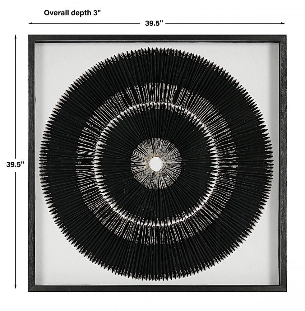 Handcrafted By Skilled Artisans, This Wall Decor Features A Striking Black and Gold Leaf Medallion. Artwork is Set Against A White Linen Backing in A Black Shadowbox Style Pine Wood Frame Under Glass.