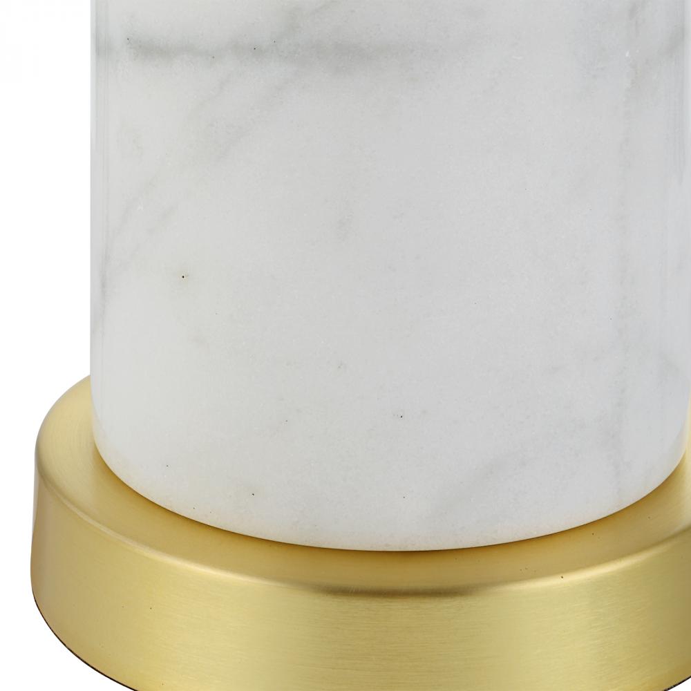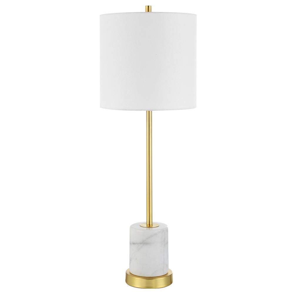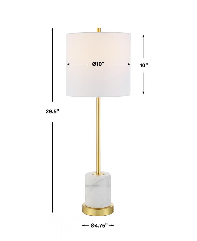 Stylish and Versatile, This Buffet Lamp Features A Slim Metal Body in An Elegant Brushed Gold Finish Paired with A Substantial White Marble Foot. The Round Hardback Shade is Covered in A White Linen Fabric.
