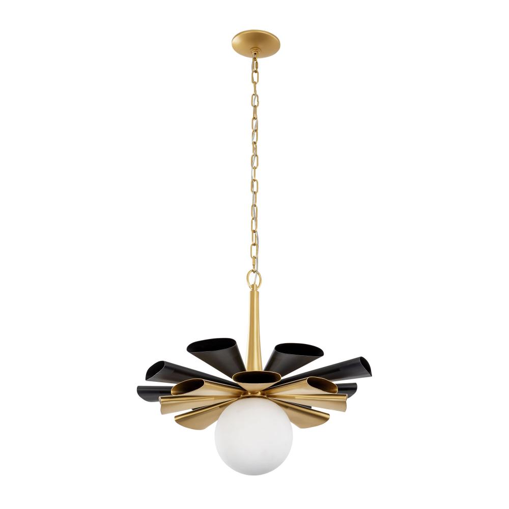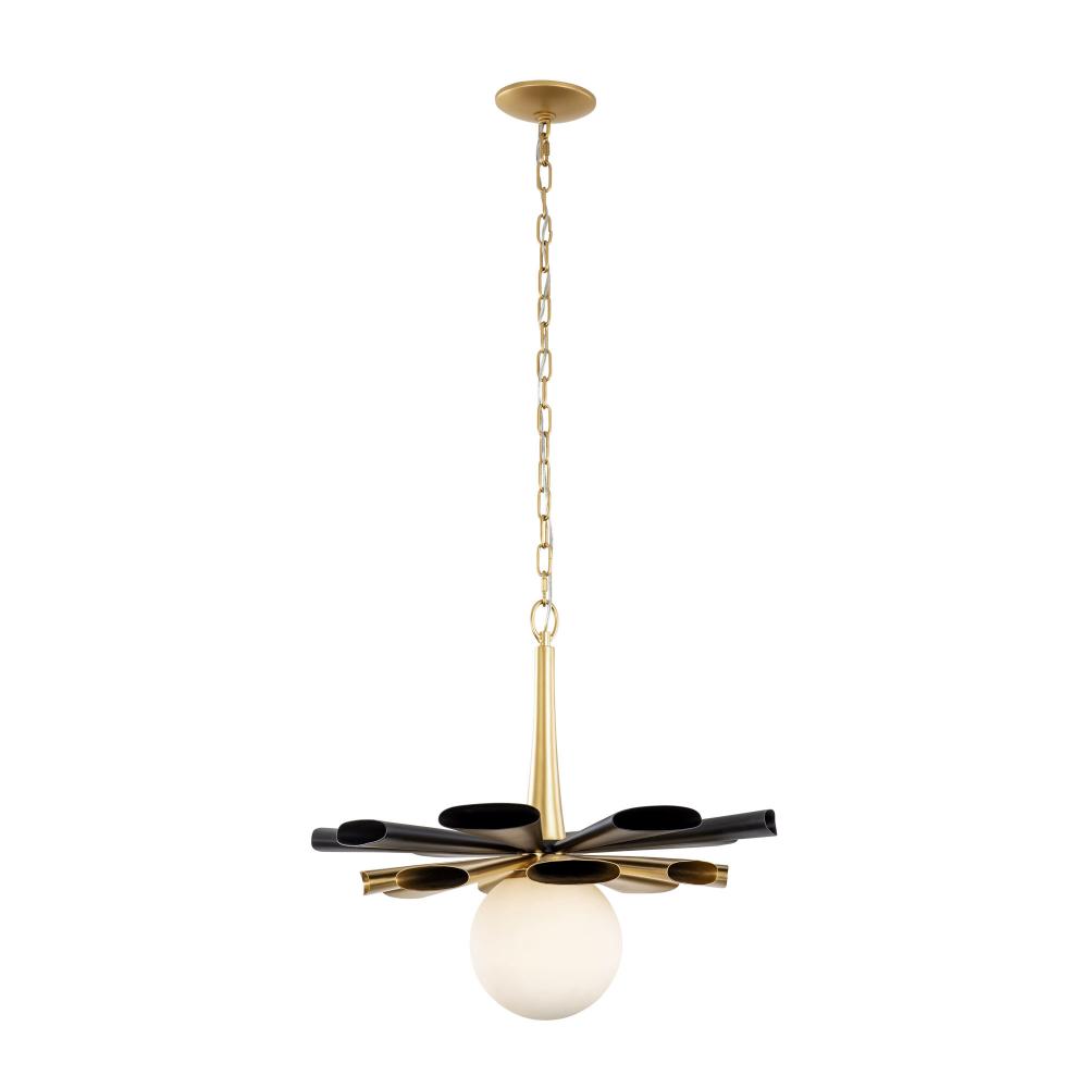 Hand-forged Tapered Oval Tubing. Hand-applied Matte Black and French Gold. Recycled Opal White GLass Globe