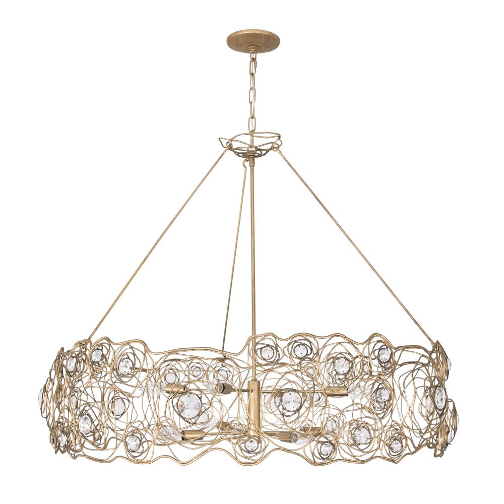A rose is a rose is a rose, until of course, it is reimagined by Varaluz. Inspired by a drawing that appeared in the Japanese design magazine, Shin-Bijutsukai (New Oceans of Art), Ethereal Rose marries swirling lines of varying thicknesses and irregular curves with a mid-century metal work technique. At the center of each rose is a multi-faceted round optic quality crystal element. The hanging stems and secondary canopy complete the wispy design motif. A Havana Gold hand-painted multi-layered finish features a unique ombre that gets darker with additional antiquing around the crystal centers.