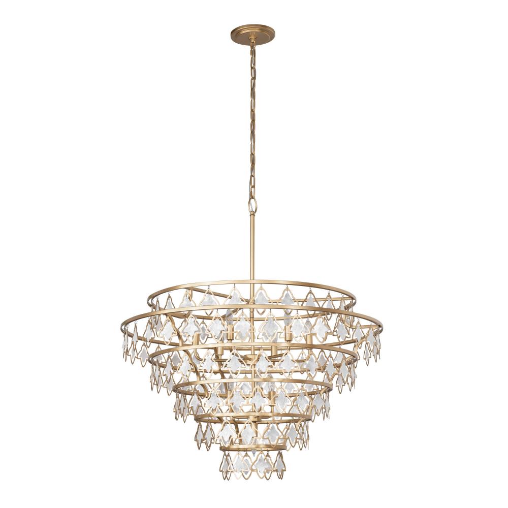 Fleur shines with inspiration from a late 19th century wallcovering housed at Cooper-Hewitt, Smithsonian Design Museum. Fleur incorporates elements reminiscent of the wallcovering's pattern of alternating, stylized, onion-top and spearhead motifs, where each one encloses a similar delicate Fleur-de-lis (Lily Flower) design. Fleur's frame builds upon the spear head motif, modernizing and simplifying the Fleur-de-lis shape as the prominent design element, which also houses a smaller Fleur-de-lis made of sustainable Capiz. Handcrafted from 70% recycled steel. Removeable top stem. Low-VOC French Gold finish.