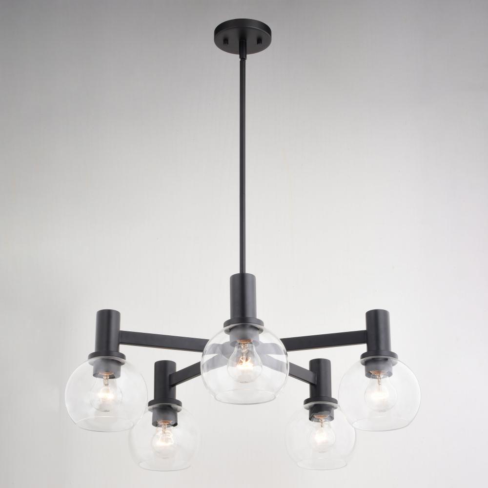 The Marshall collection is transitional style with a contemporary flair at a competitive price. Stately arms finished in matte black support clear glass globes for the perfect balance of dark versus light. Height is adjustable with the included down rods; compatible with sloped ceilings. This chandelier light is ideal for dining areas, kitchens or any other living area where a little extra style is desired.