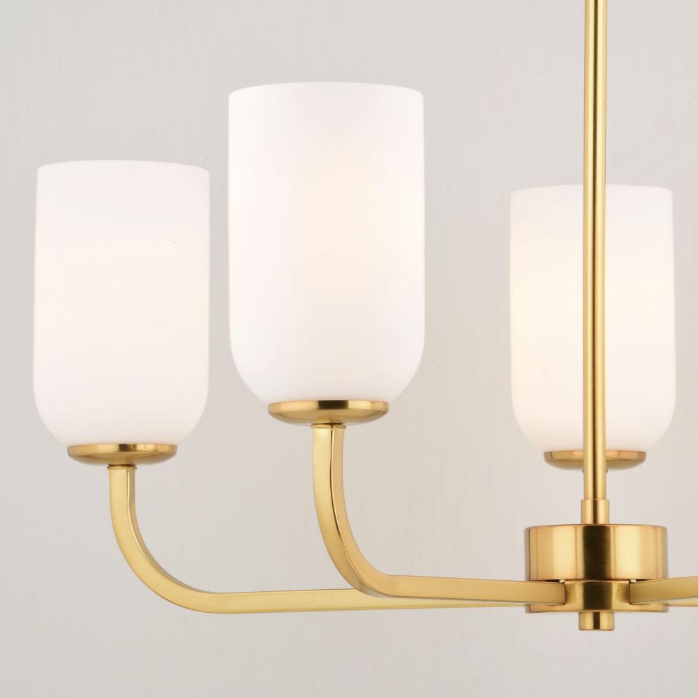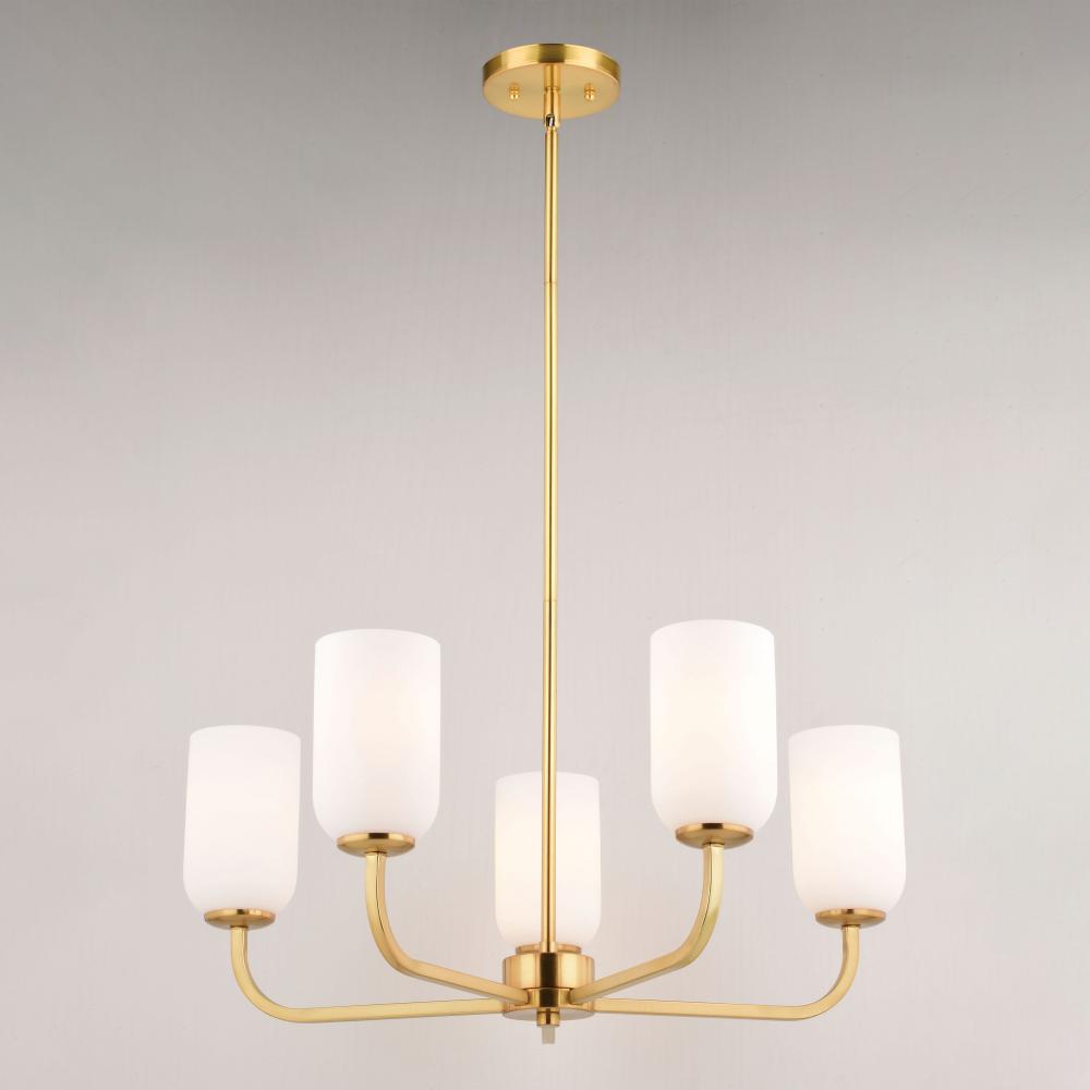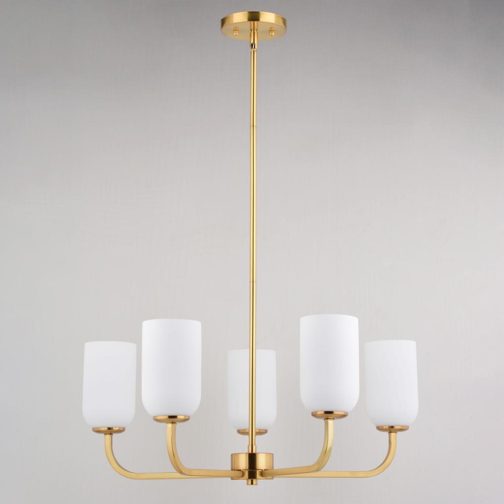 Illuminate your dining room, living room, or foyer with the Shelby 5 Light Chandelier. Its classic design and natural brass finish add a touch of timeless sophistication for both transitional and contemporary spaces. The elongated white dome-shaped glass shade emits a soft, diffused light, creating a warm and inviting atmosphere that's perfect for a cozy family dinner or a grand evening of entertaining.