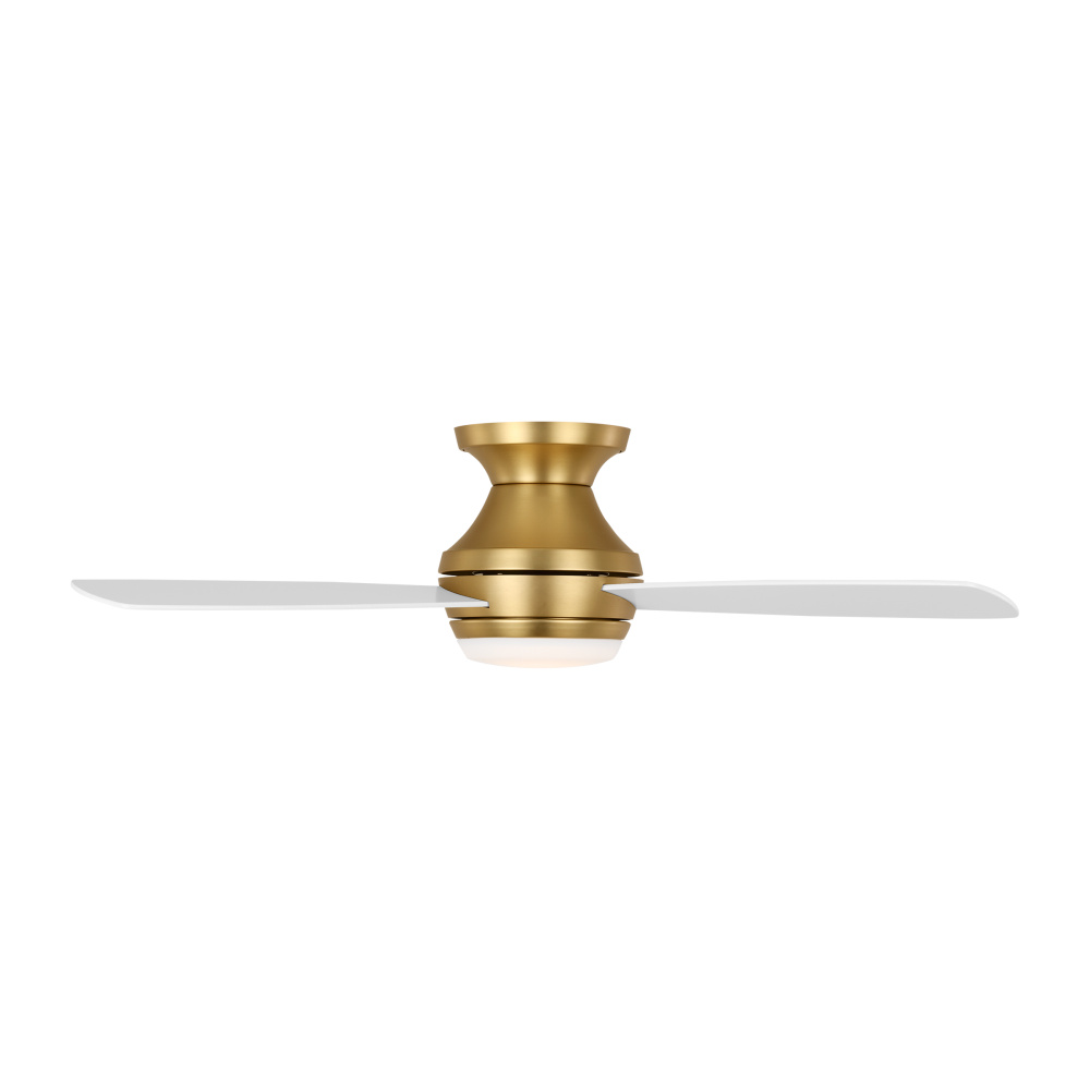Ikon 44 Hugger LED Ceiling Fan in Burnished Brass with Matte White Blades and Light Kit