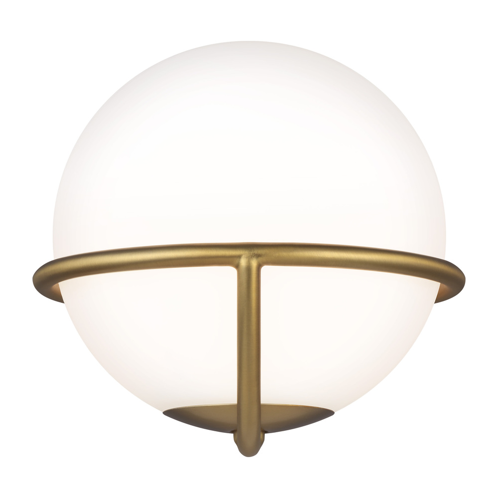The modernist Apollo impresses with perfectly balanced White Opal Etched Glass globes that gently rest within a spherical Burnished Brass or Polished Nickel frame. Apollo's cosmic appeal and artistic mid-century design is sure to become the focal point of any space.