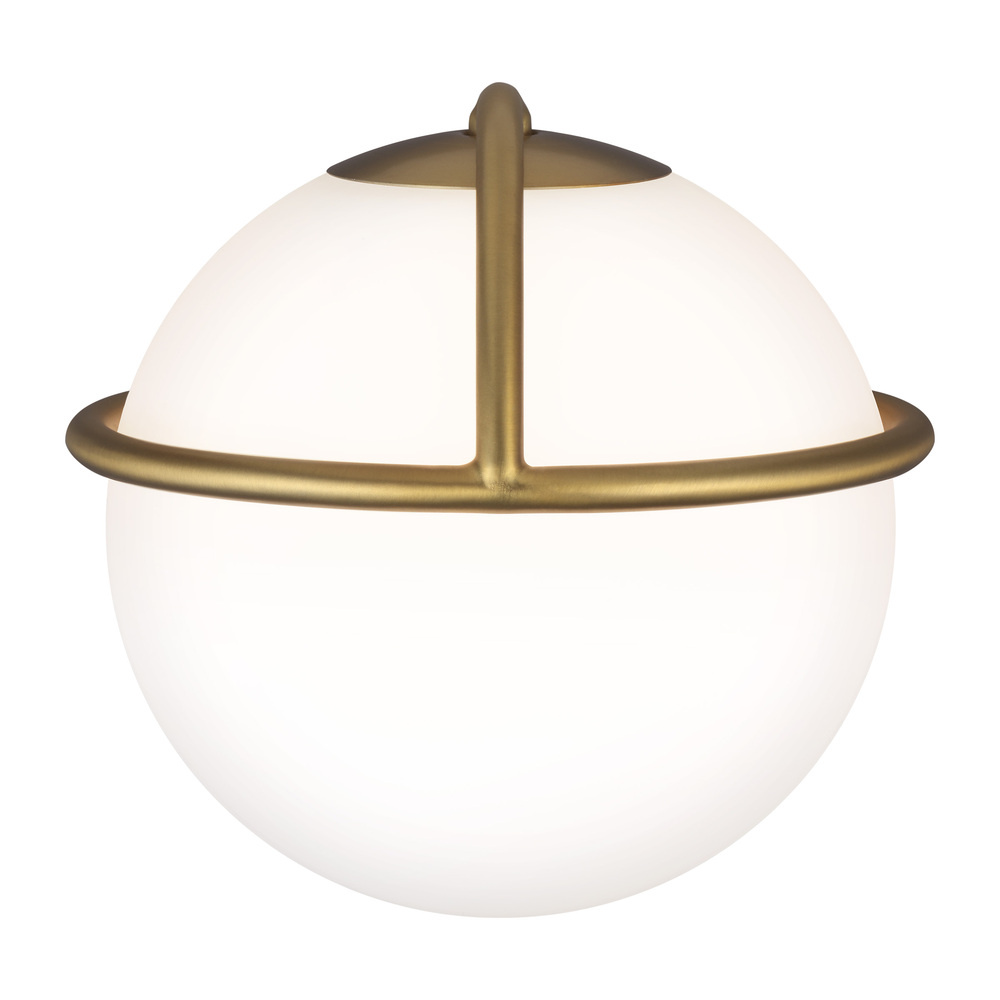 The modernist Apollo impresses with perfectly balanced White Opal Etched Glass globes that gently rest within a spherical Burnished Brass or Polished Nickel frame