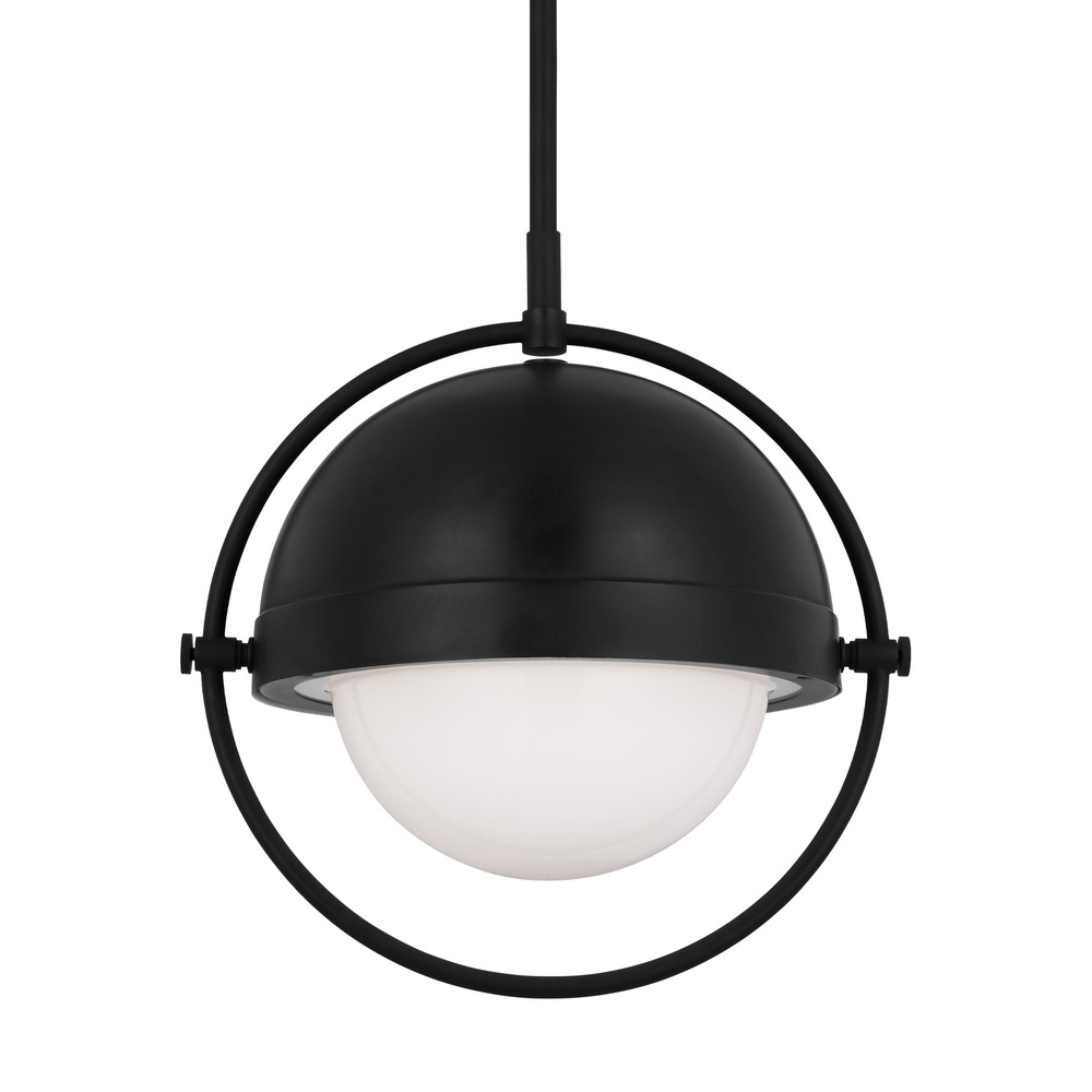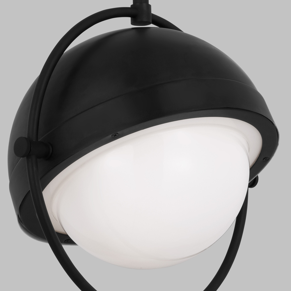 The Bacall one light indoor pendant by Thomas O'Brien is a modern rotating pendant with a deco-era cinematic feel. Glowing beneath the metal shade, the Milk White glass shade softens the light from the bulb inside. Perfect as a direct downlight, it can look unique by positioning it to the right, left, or even rotated entirely upwards.