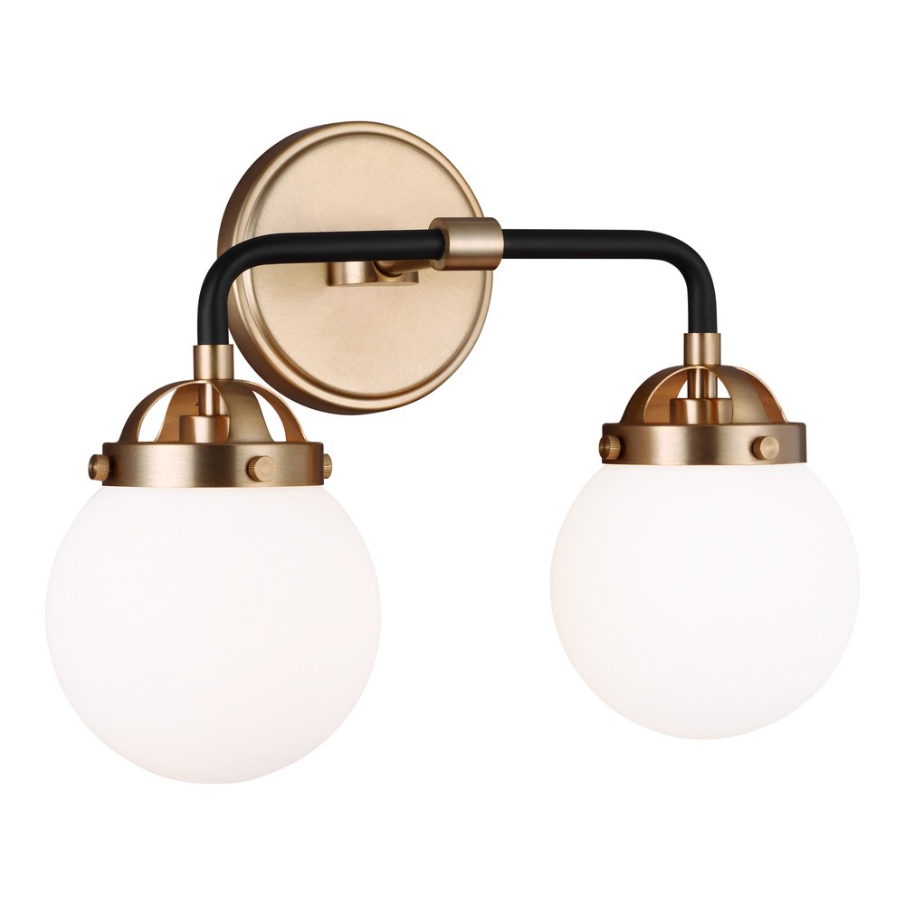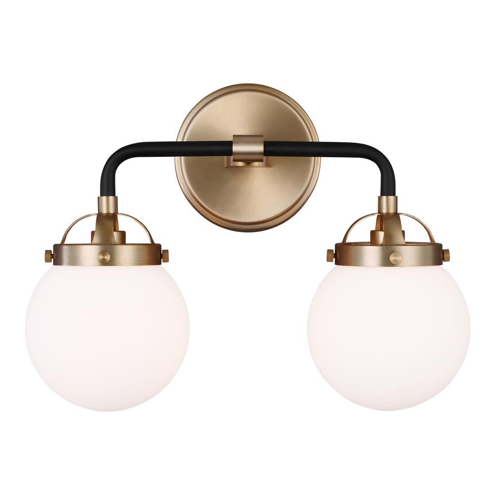 The Cafe two light vanity fixture in satin brass offers shadow-free lighting in your powder room, spa, or master bath room. Â Handsome two-tone finish and white glass globe shades.
