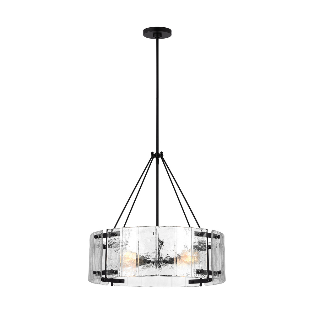 Clean and crisp, The Calvert series by Alexa Hampton is the perfect blend of function and beauty. Light flows freely through the Clear Textured glass shade while the rounded corners bring out the softness. Available as a medium chandelier with Aged Iron, Burnished Brass, or Polished Nickel finishes.