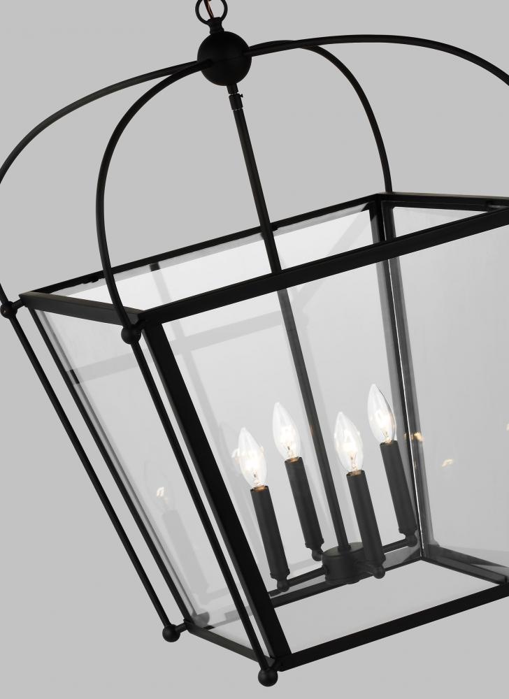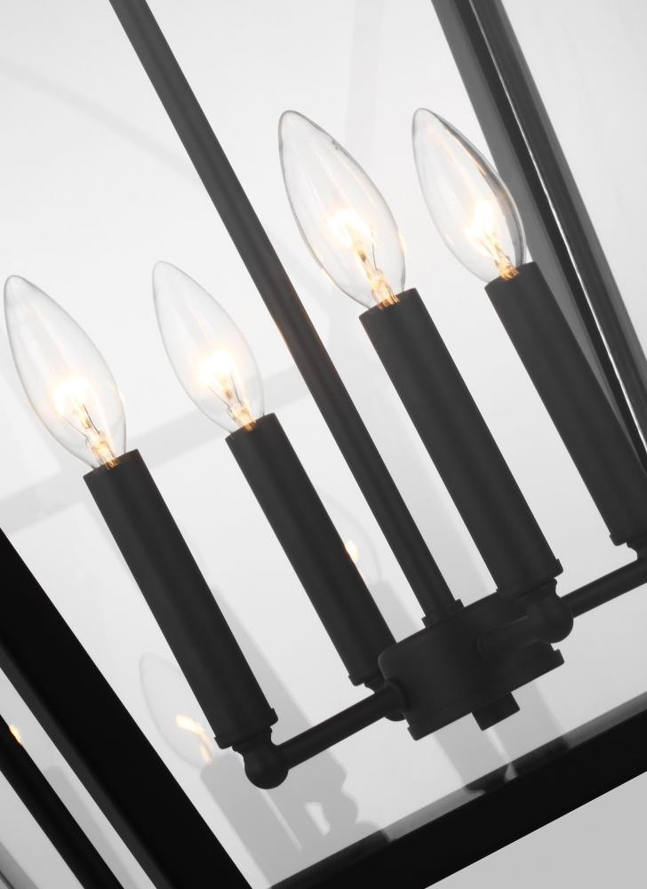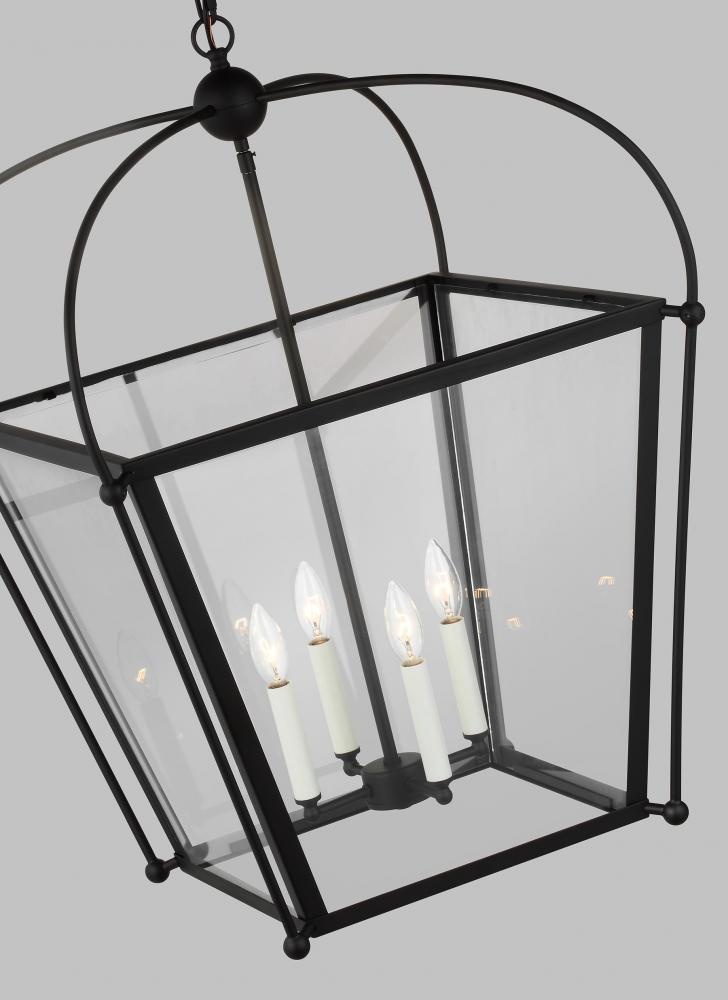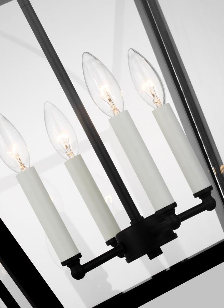 The Charleston four light indoor pendant in Midnight Black is crafted from metal, its frame is steeped in sophistication with an openwork silhouette accented by a curved top. Candelabra-inspired lights sit inside, highlighted by glass panels for a warm and even gleam.