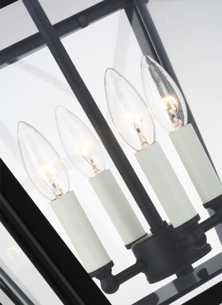 The Charleston four light indoor pendant in Midnight Black is crafted from metal, its frame is steeped in sophistication with an openwork silhouette accented by a curved top. Candelabra-inspired lights sit inside, highlighted by glass panels for a warm and even gleam.