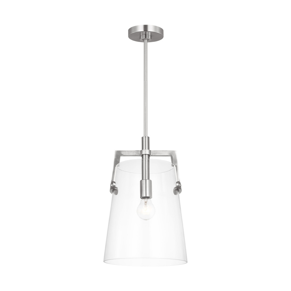 Crafted with Steel in a Brushed Nickel finish with clear glass shade