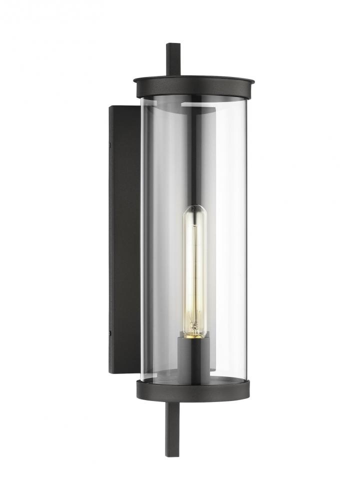 The Eastham one light outdoor wall fixture in textured black by Chapman & Myers is designed with an upright square metal crossbar which extends beyond the top and bottom of each light to both support and define each light. The crossbars intersect two stepped top & bottom metal rims and capture the cylindrical glass shade. Each is illuminated by a tubular filament bulb.