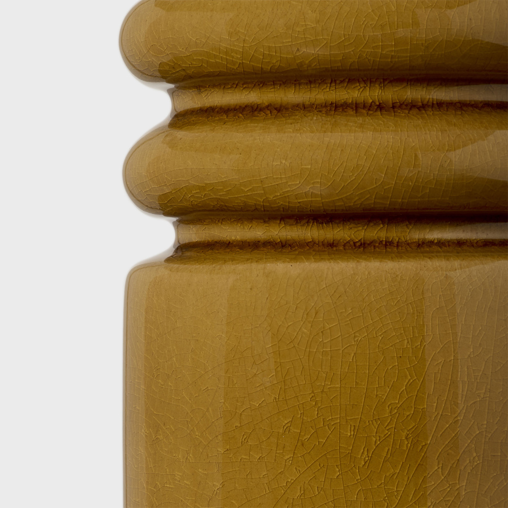 Crafted with Ceramic in a Cracked Honey finish with white linen fabric shade