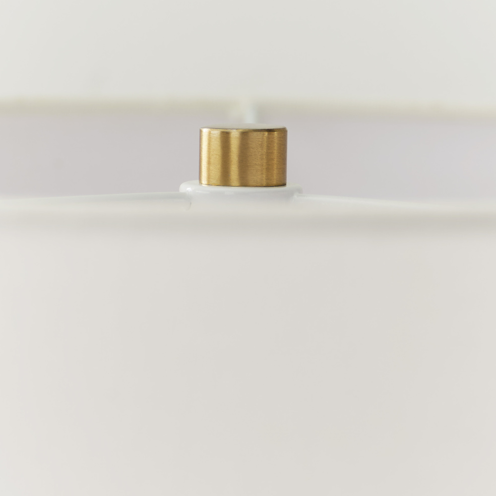 Features a square base, gold stem, and fabric white linen shade