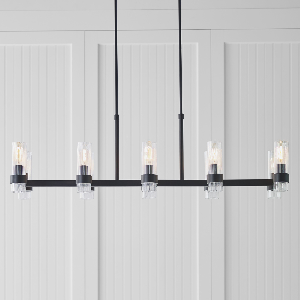 Designed by Chapman & Myers, the Geneva ten light billiard island chandelier in Aged Iron is the perfect way to achieve your desired fashion or functional needs in your home. A fluted shade forms an elegant, dynamic silhouette balanced by a strong frame of Aged Iron, Burnished Brass, or Polished Nickel.