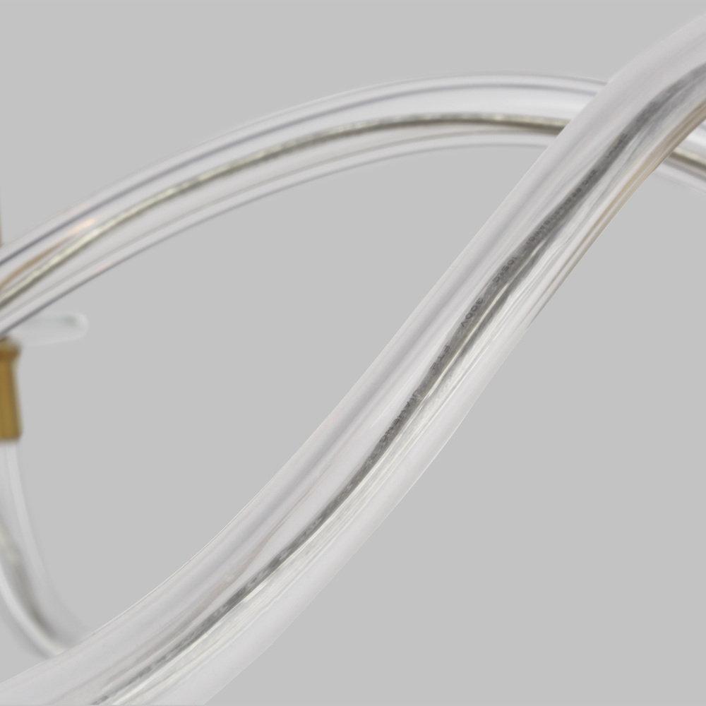 In the Hanover six light single tier chandelier, slender curved, tapered arms form an elegant, dynamic silhouette that stems from a hub of either Burnished Brass and Polished Nickel finish and extends to matching color candle tubes, topped with exposed candelabra bulbs.