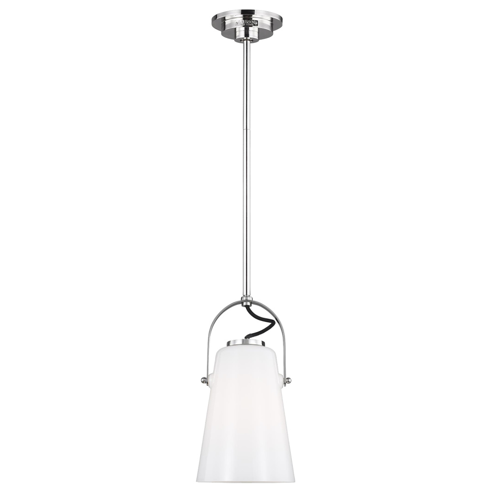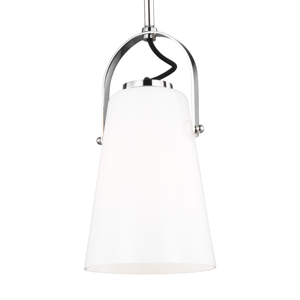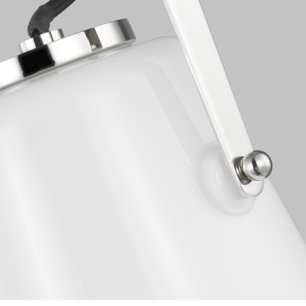 Hazel updates an industrial form with elegant white milk glass. Branded canopy detailing and an exposed fabric black cord creates a refined foundation for modern living The curved metal above the shade draws inspiration from the stirrups on a horse or saddle.