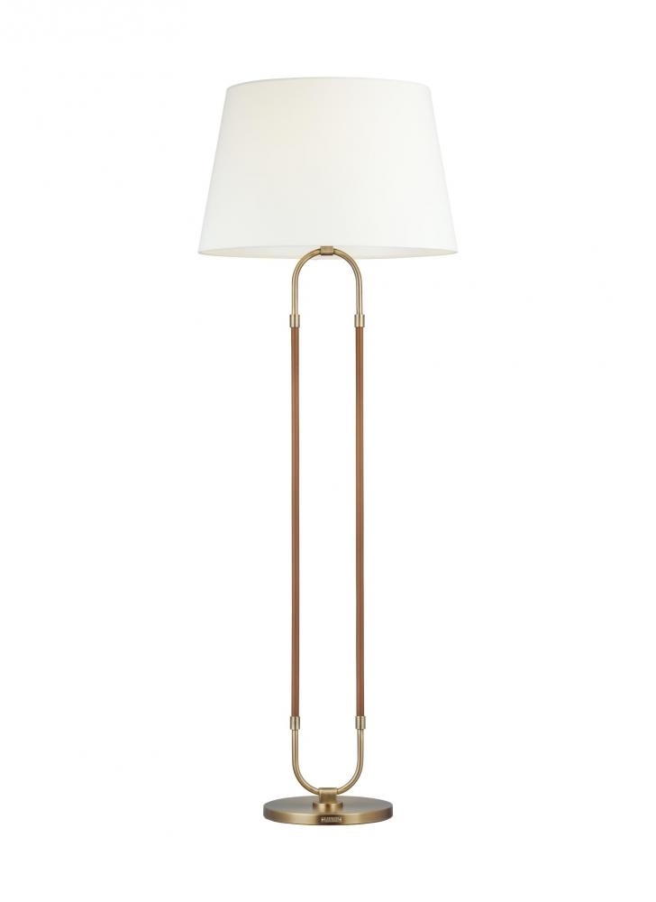 In the Katie one light floor lamp leather straps contrast with metal and white linen fabric shade to round out a timeless design. Available in: Time Worn Brass with Brown Leather or Polished Nickel with Black Leather. The combination of leather and steel gives this round chandelier equestrian flair.