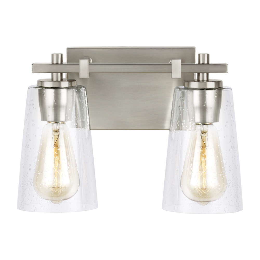 The Sean Lavin Mercer two light vanity fixture in satin nickel provides abundant light for your bath vanity, while adding a layer of today's style to your interior design. Modern details, like the clean square supports of the cross arm and sleek, rectangular backplate, are defining features of the Mercer. Choose from either refreshingly bright Chrome or warm, rustic Oil Rubbed Bronze hardware for a distinct look, both with tapered Clear Seeded glass shades that complete the tailored look.