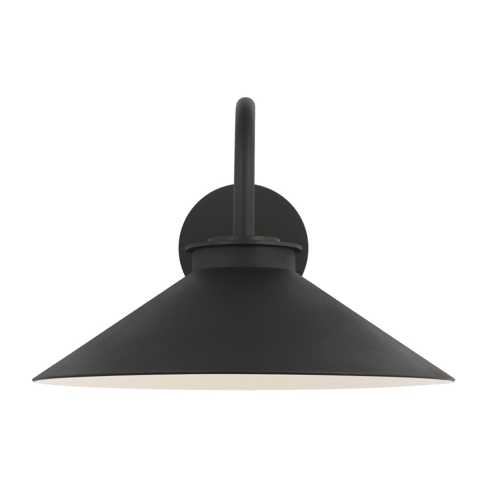 The Modern Barn Lights by Sean Lavin has a minimal silhouette and a textured Black finish, bringing a modern and industrial style to your main entrance. It's made from metal, and it hangs from a round back plate and a sleek, curved arm. The shade has a bell-shaped design that reminds us of classic barn lamps This elegant light is a beautiful and functional wall lantern with industrial accents, complementing porches, patios, and other outdoor areas.