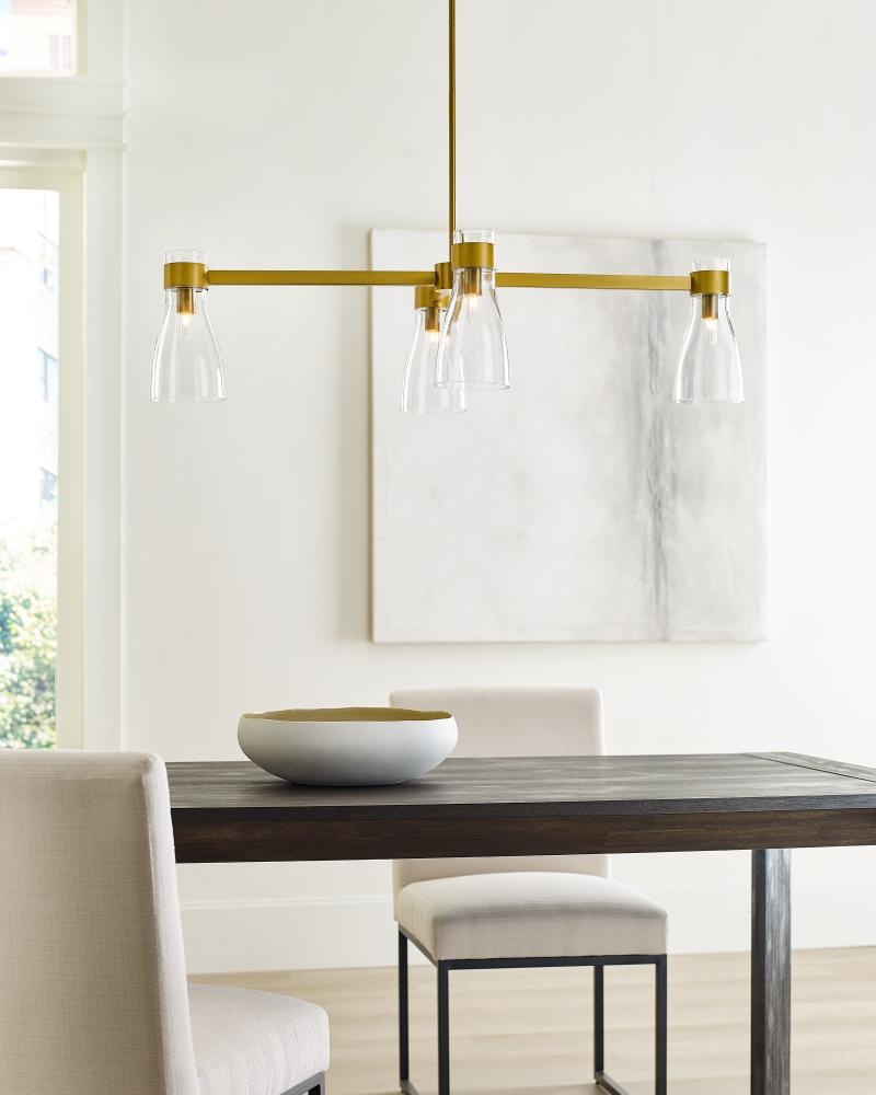 The Moritz four light single tier chandelier in burnished brass is created around a linear frame includes five glass shades originally inspired by the form of classic task lamps, giving it a contemporary twist. A beautiful focal point in living and dining rooms.