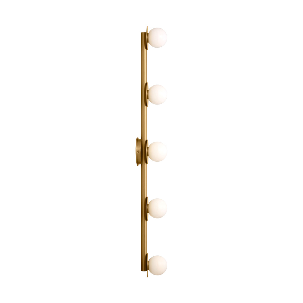 Light radiates from milk glass globes set against removable metal discs.