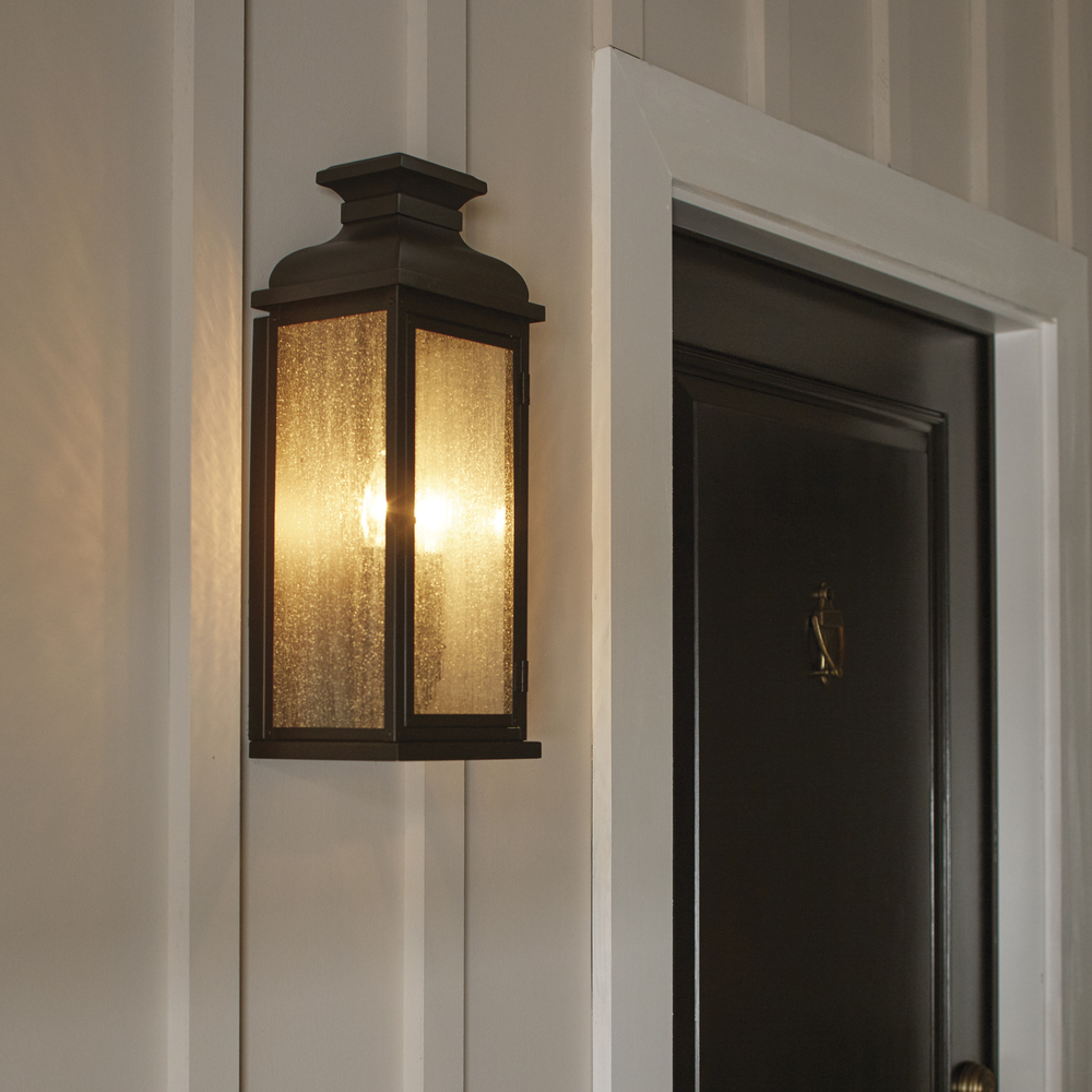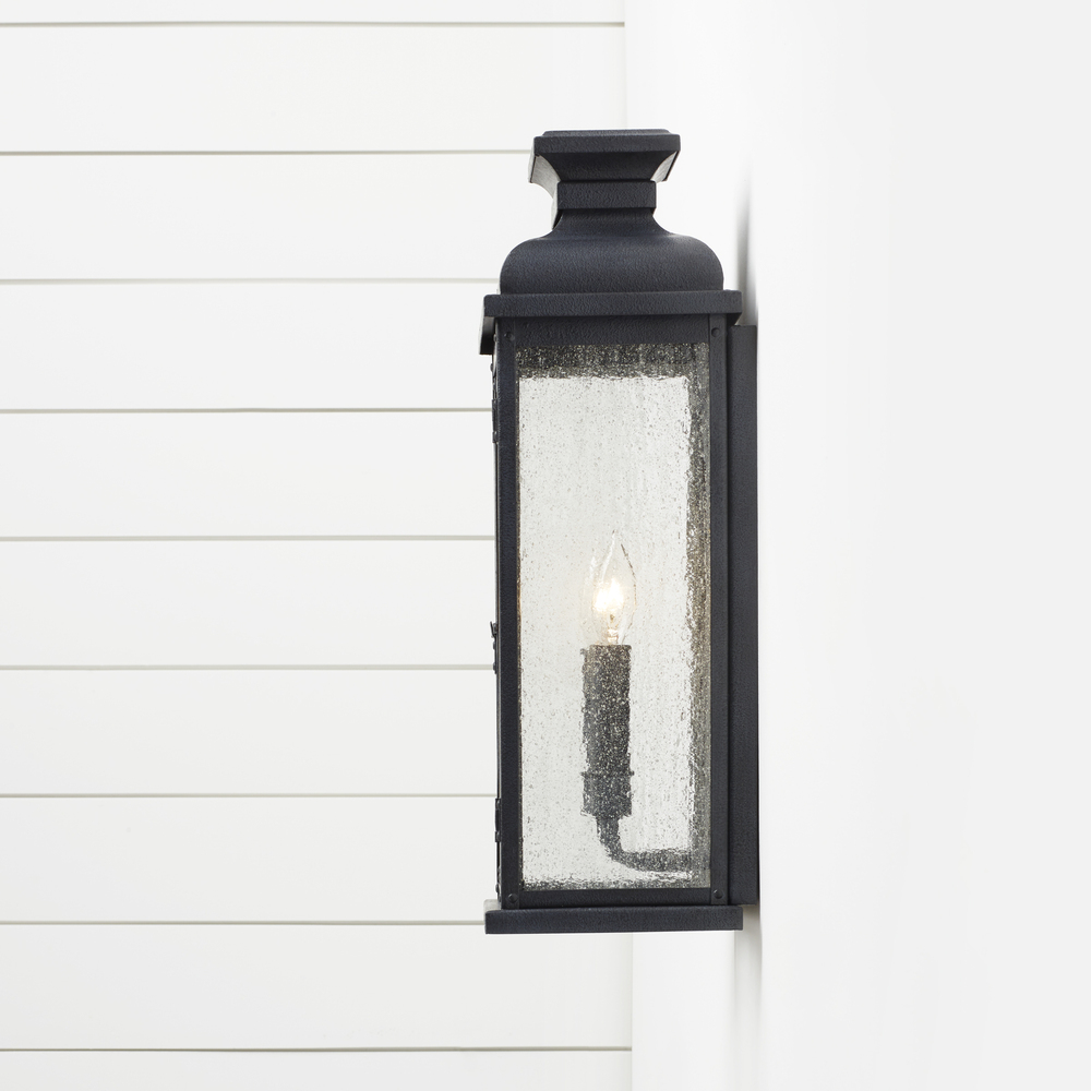 Inspired by distinctive outdoor lanterns commonly found throughout the streets of London, the crowning detail of the traditional Pediment outdoor lighting collection by is its classically, curving roof line. The hinged and latched front panel adds a historical reference and also makes relamping easy. The Clear Seeded glass subtly obscures the lamping and helps create the visual appearance of vintage gas lanterns. Offered in a Dark Weathered Zinc finish, all fixtured rated for wet locations.