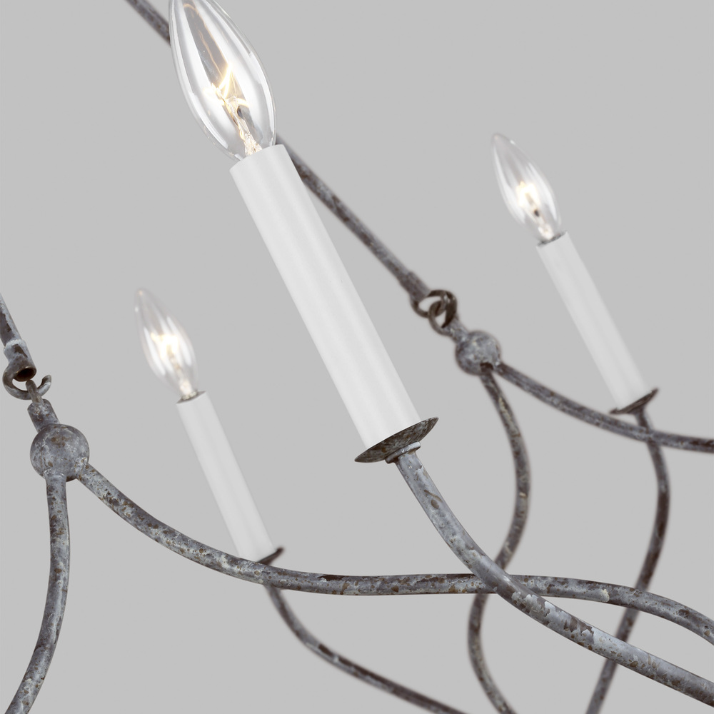 The Richmond twelve light single tier chandelier lends romance and whimsy to any space. A Weathered Galvanized finish forms the twisted fixtures of the eye-catching Richmond series designed by Chapman & Myers for Visual Comfort Studio. This exquisite piece features cream candle tubes and epitomizes the timeless French Country style. Since it is damp-rated, Richmond makes a great statement piece in indoor as well as covered outdoor spaces.