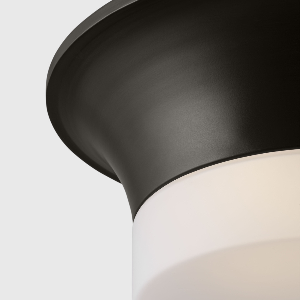 The Sina flush mount by Alexa Hampton plays with proportion through a shallow cylinder and generous flared silhouette. The striking contrast between the dark metal band and white glass diffuser is complemented by a softly cast glow. Available in two finishes, the Sina flush mount silhouette will fit effortlessly into any room.