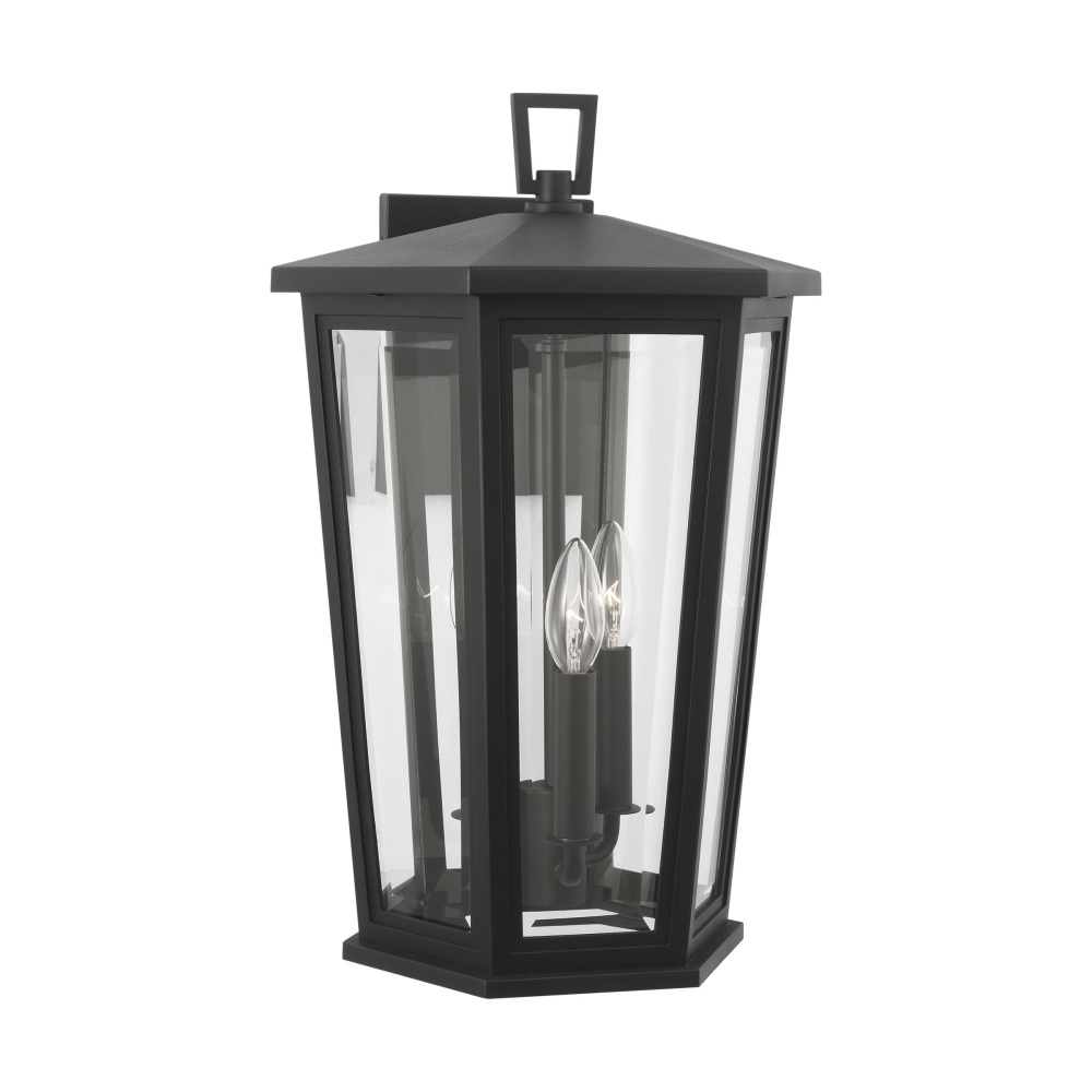 The Witley outdoor series by Sean Lavin Lighting is reminiscent of traditional outdoor oil lanterns with several individual panes of glass coming together to create facets that catch the light. Generous proportions in the Textured Black finish and Clear Beveled glass provide generous illumination to welcome guests and brighten passageways. The assortment includes mini, small, medium, large, and extra-large outdoor wall lanterns, a medium pendant, and a 3-light outdoor post lantern.