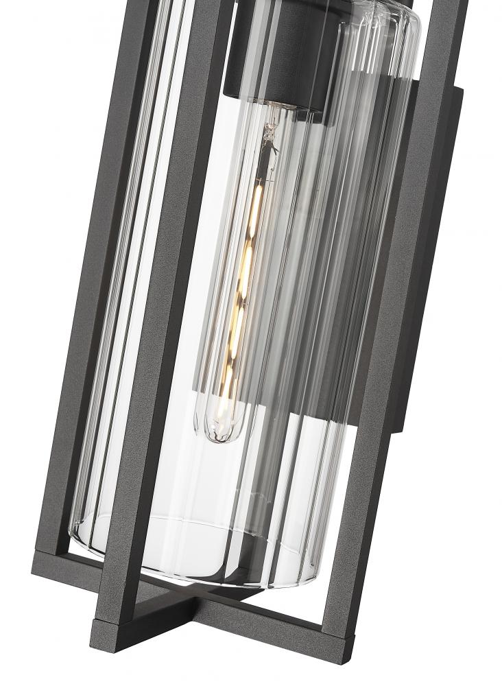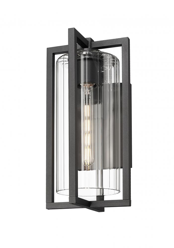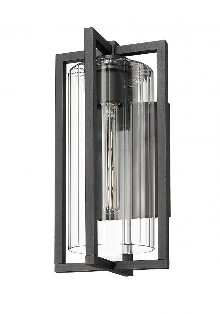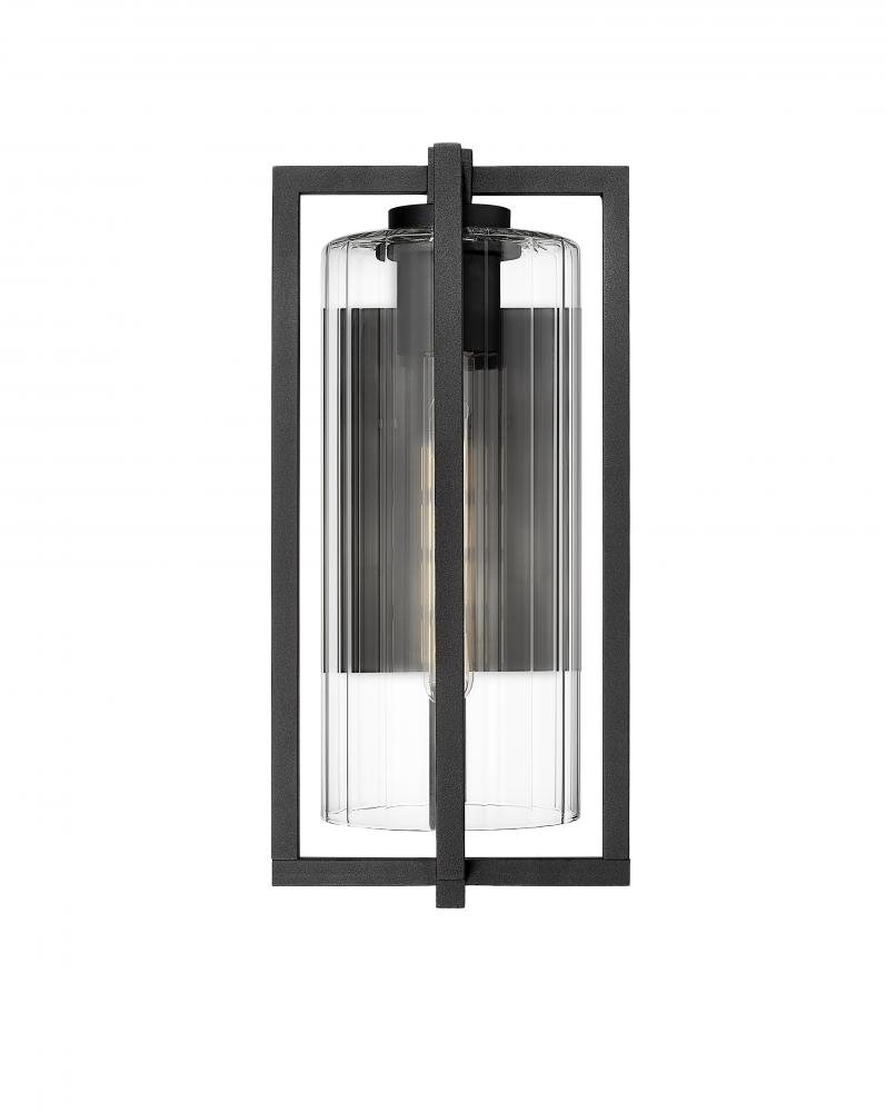 Clean lines intersect, offering a multi-plane dimensionality and turning this modern one-light outdoor wall light into a sophisticated way to illuminate a structure or patio space. A Coastal black paint finish inspires elegance matched by ribbed clear glass in a cylinder shade. This fixture is dimmable, delivering varying light levels.