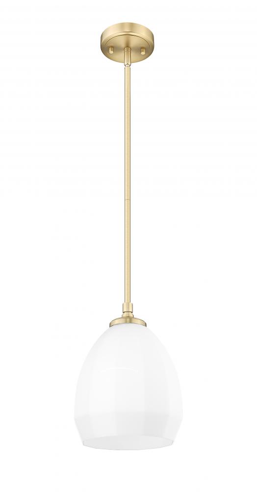 Delicate shaping perfectly enhances the domed profile of a modern classic one-light pendant thats perfect for your inviting home. Its modern gold finish plays up vintage character and warmth, while a matte opal glass shade is clean and refined to deliver beautiful illumination.