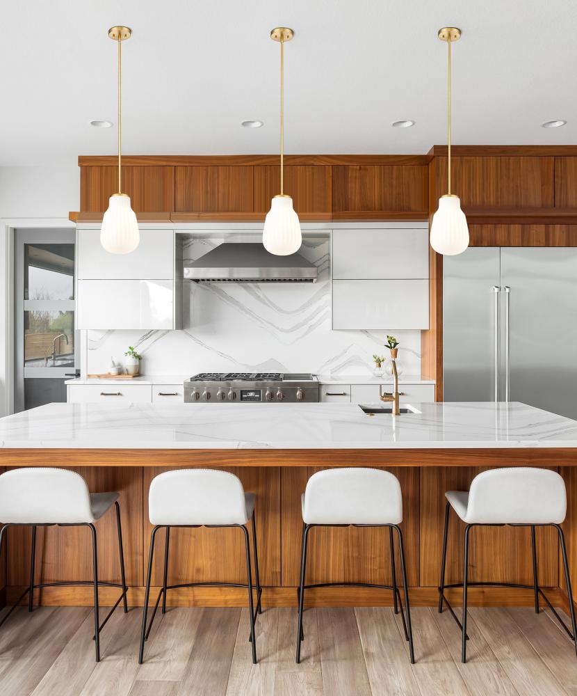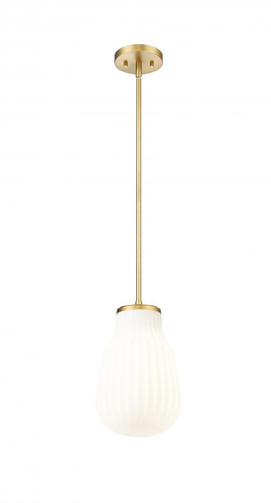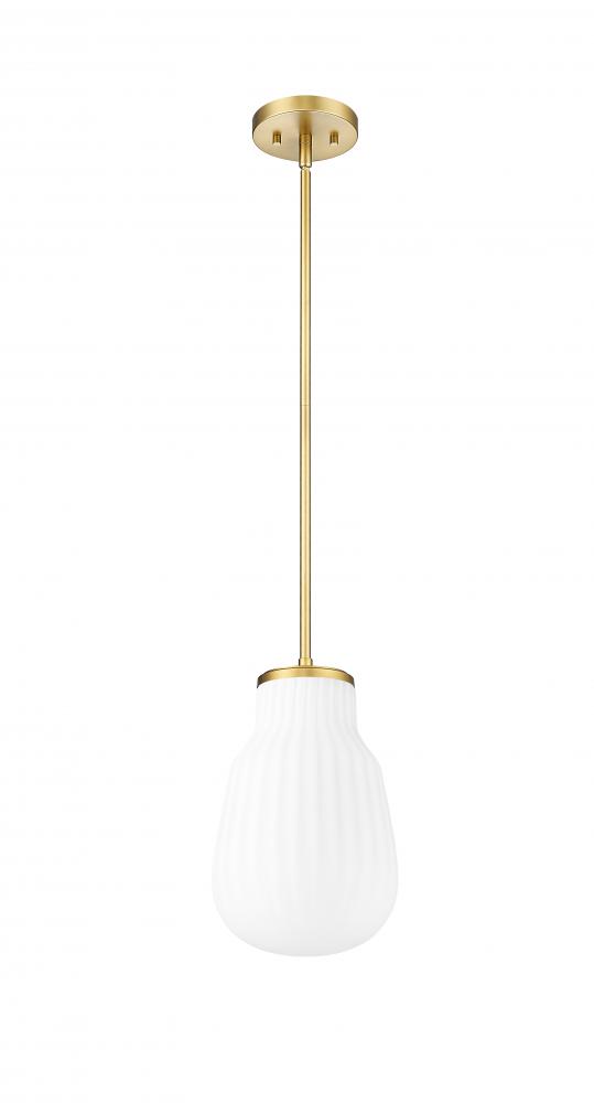 Make a statement in your bedroom or kitchen with the fresh, refined style of a modern one-light pendant. Updated schoolhouse style infuses the fixture, which boasts delicately ribbed glass in opaque white, lending soft illumination and inviting ambiance. A modern gold finish over its frame, down rod, and canopy adds the perfect dose of warm sophistication.
