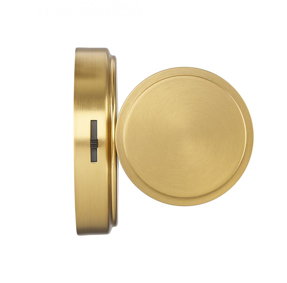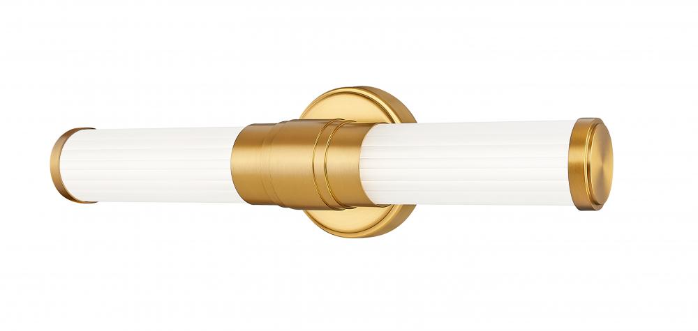 Modern gold finishing creates sophisticated warmth for the clean lines of this modern LED vanity bath light. The integrated LED is dimmable and energy efficient, offering five color selections to ensure the perfect ambiance for your space. The fixture features delicately ribbed cylinders of opal glass, ensuring inviting illumination.