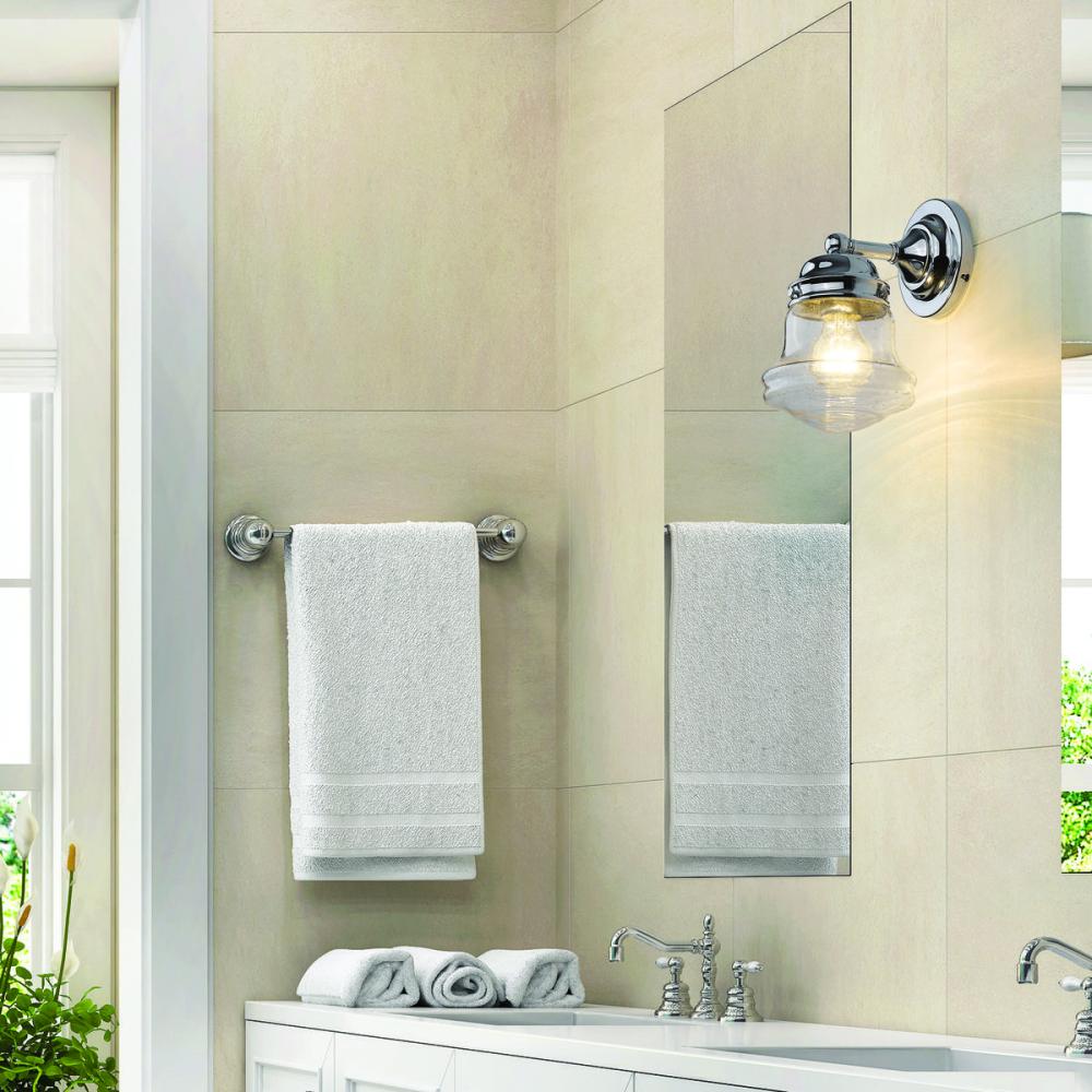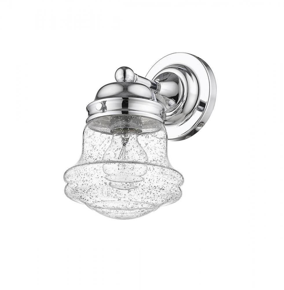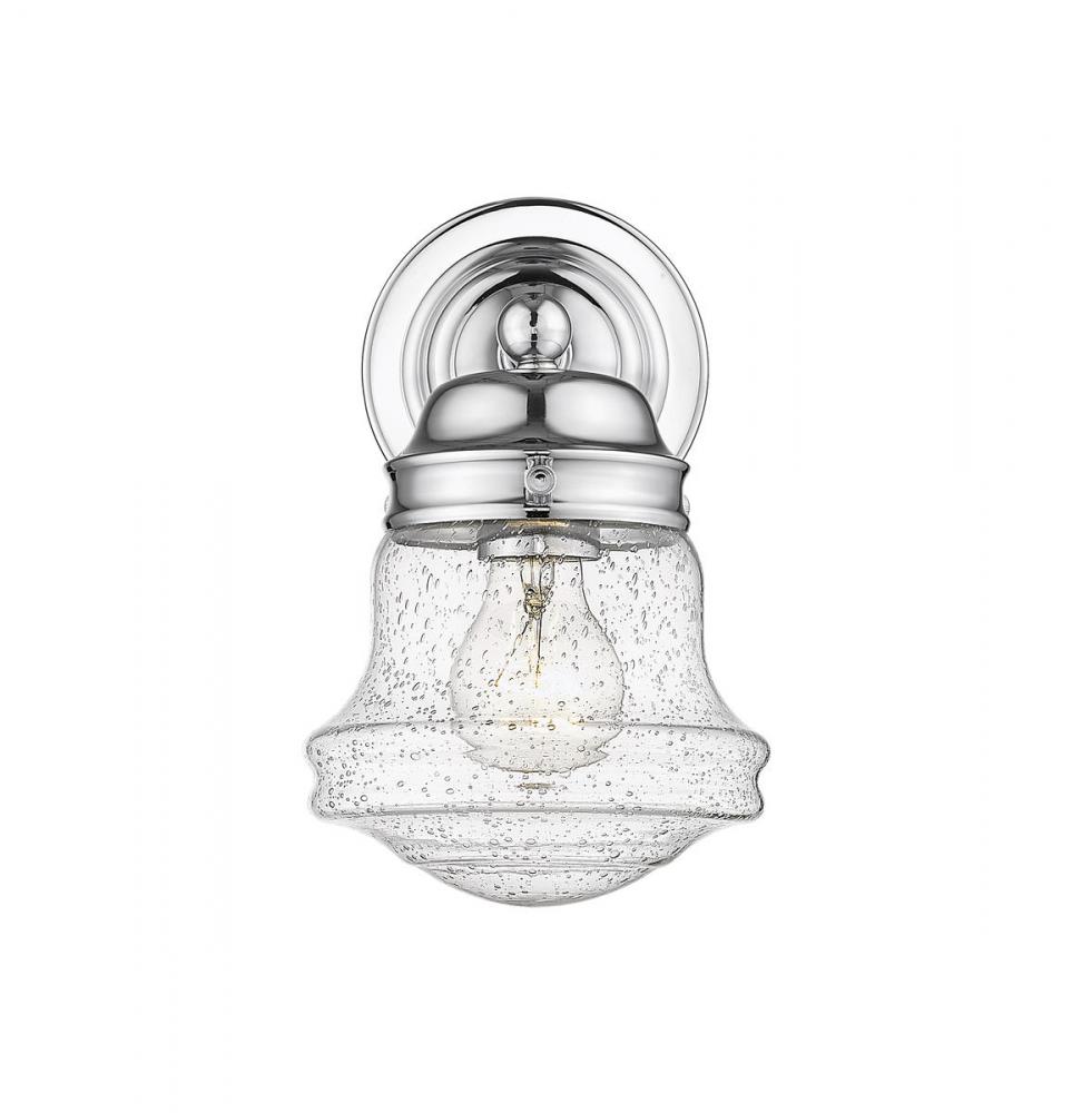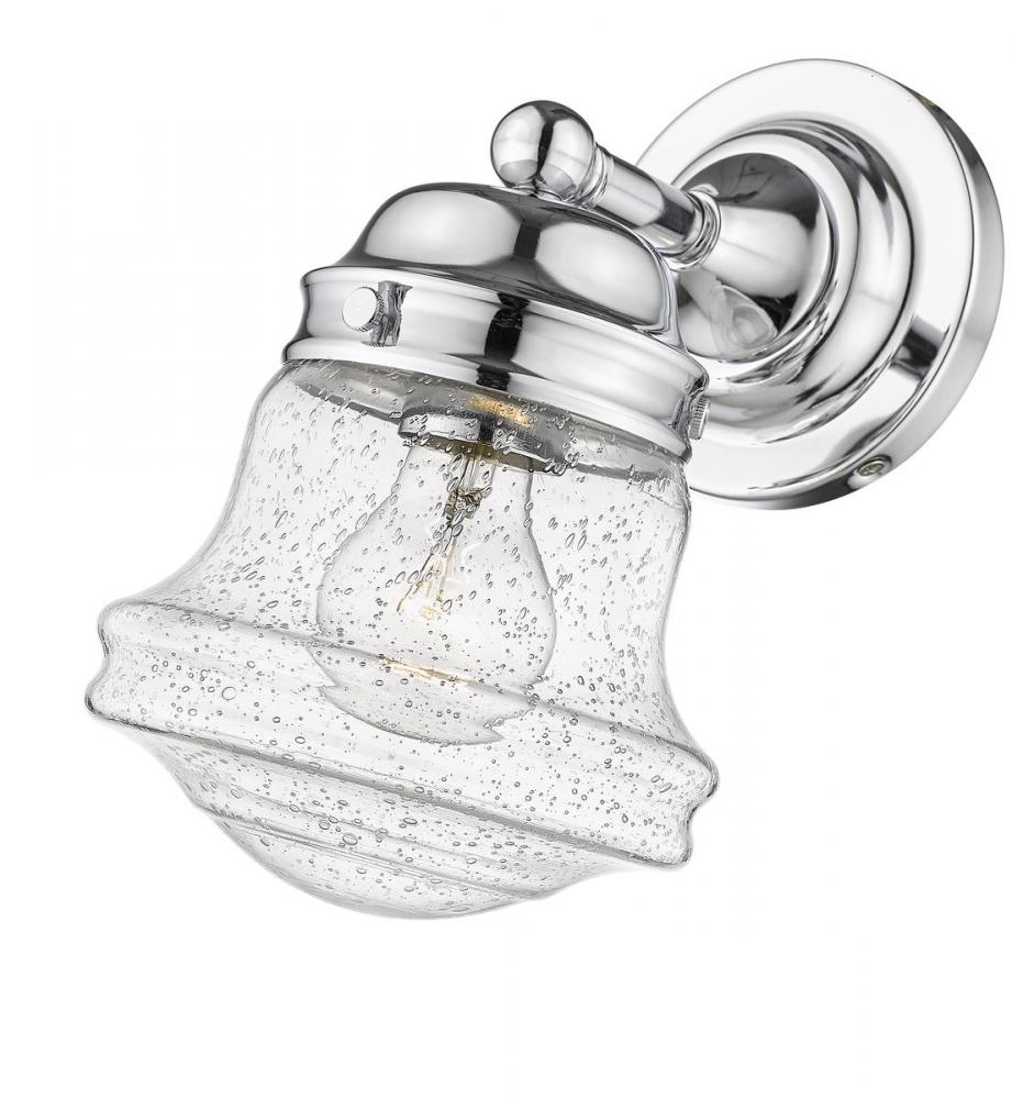 Low-key and tasteful, this one-light wall sconce from the Vaughn collection lifts the mood in a casual space with a charming village-inspired theme. Blending nautical with industrial, this sconce features a clear seedy glass shade in a unique schoolhouse shape, nestled to a gleaming chrome finish steel frame with a dimensional round wall mount and holder and an extra accent piece.
