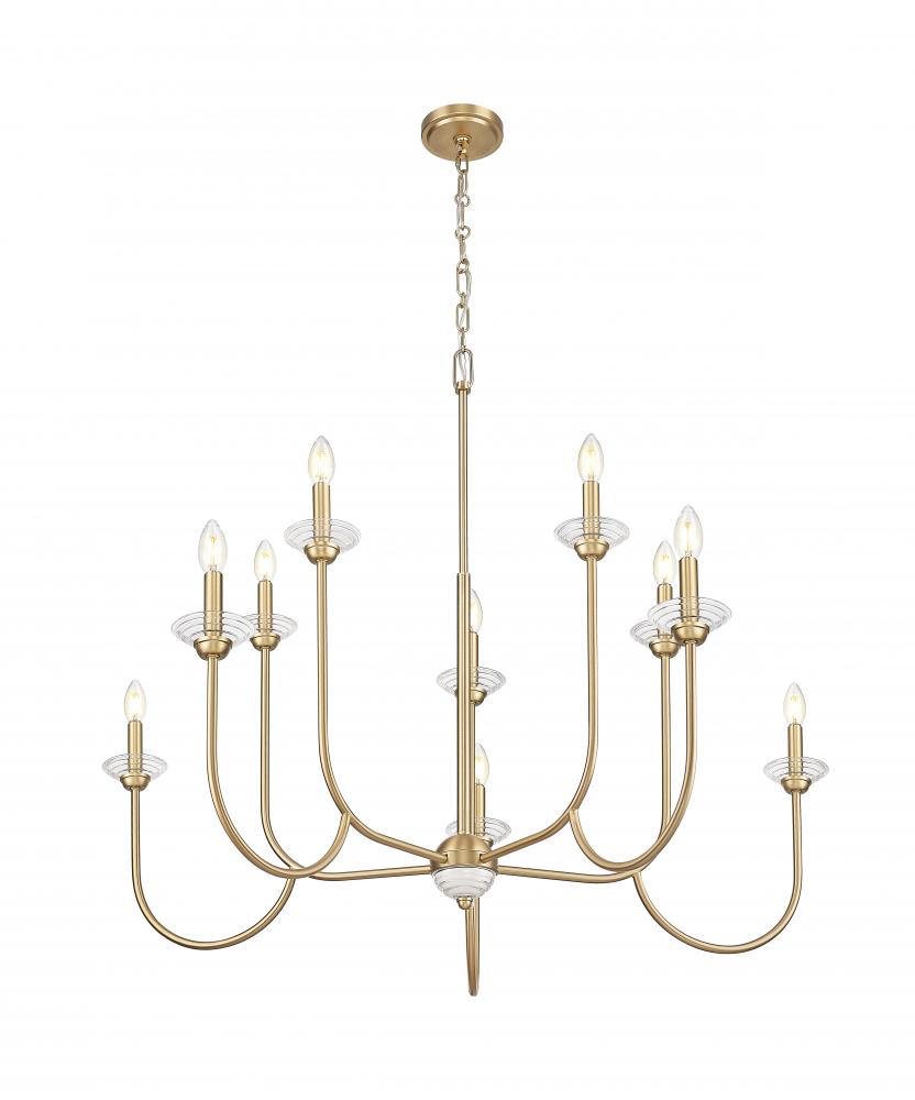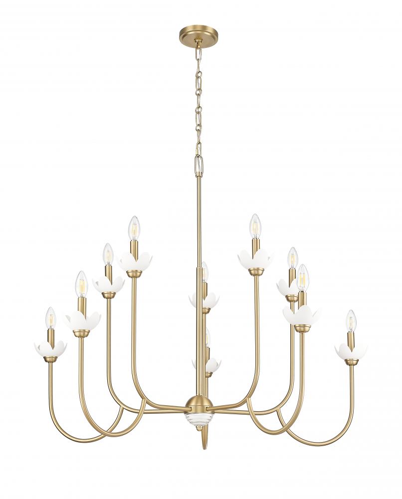 A tiered effect and floral details bring unmistakable charm and mid-century character to a transitional 10-light chandelier. A rich modern gold finish graces its frame, while interchangeable bobeches in white metal and clear glass create a sense of delicacy and freshness. A smooth clear glass orb centers the design and adds rich radiance.