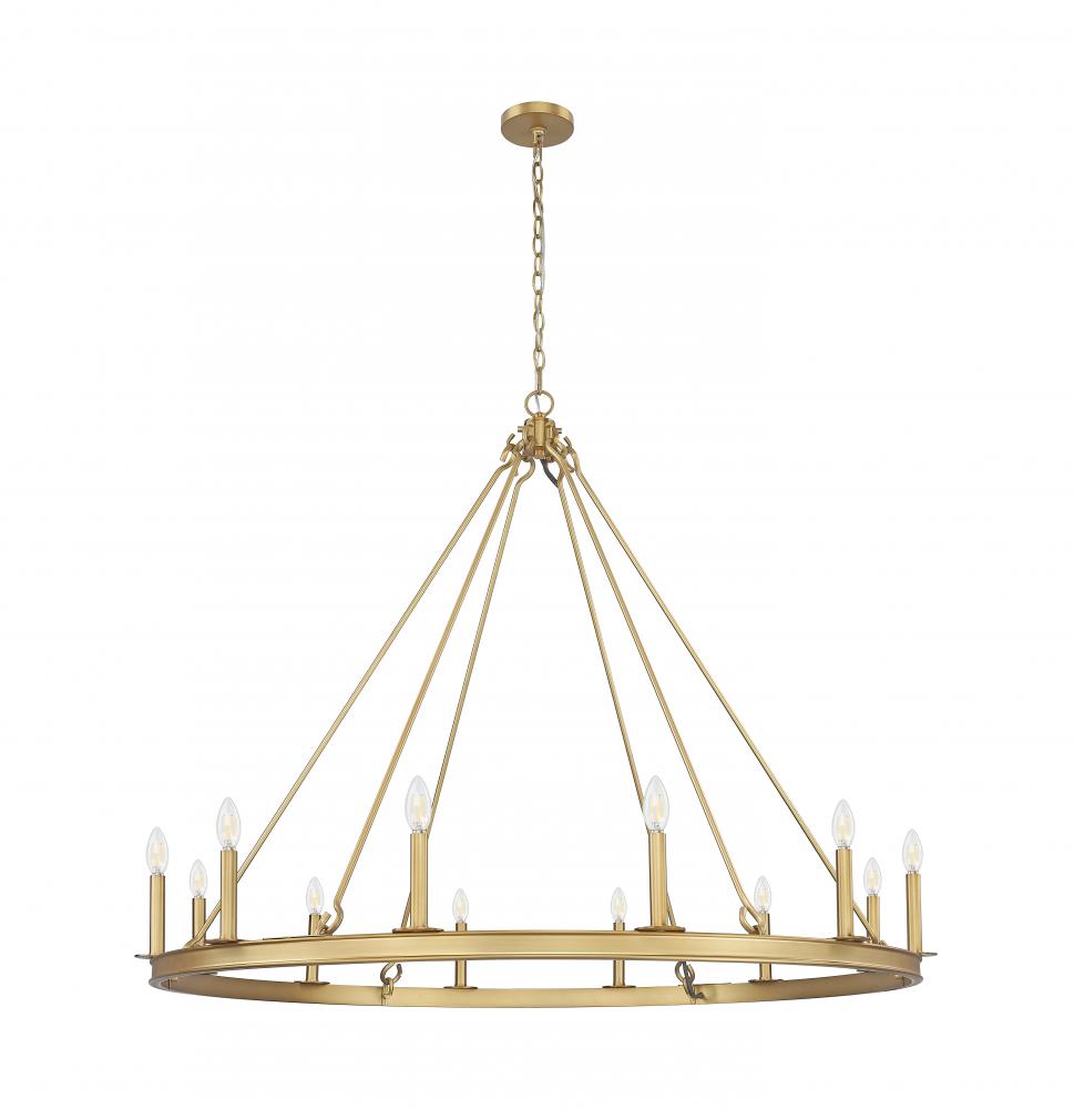 A classic ring frame lends drama of scale to this modern 12-light chandelier. Blending beautifully in coastal, contemporary, or restoration decor, it features a rubbed brass finish over steel construction, complete with candelabra light for soft, inviting illumination.