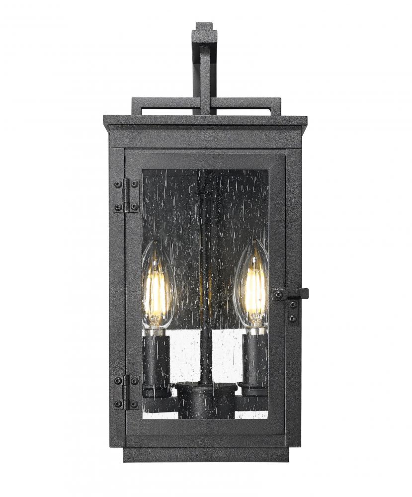 A timeless silhouette in a sand black finish brings just the right amount of mood to your entryway with this outdoor wall light. Two candle-style lights shimmer gently behind clear seedy glass, adding soft warmth and old-world charm. Its ideal for flanking doors or adding glow to cozy corners.