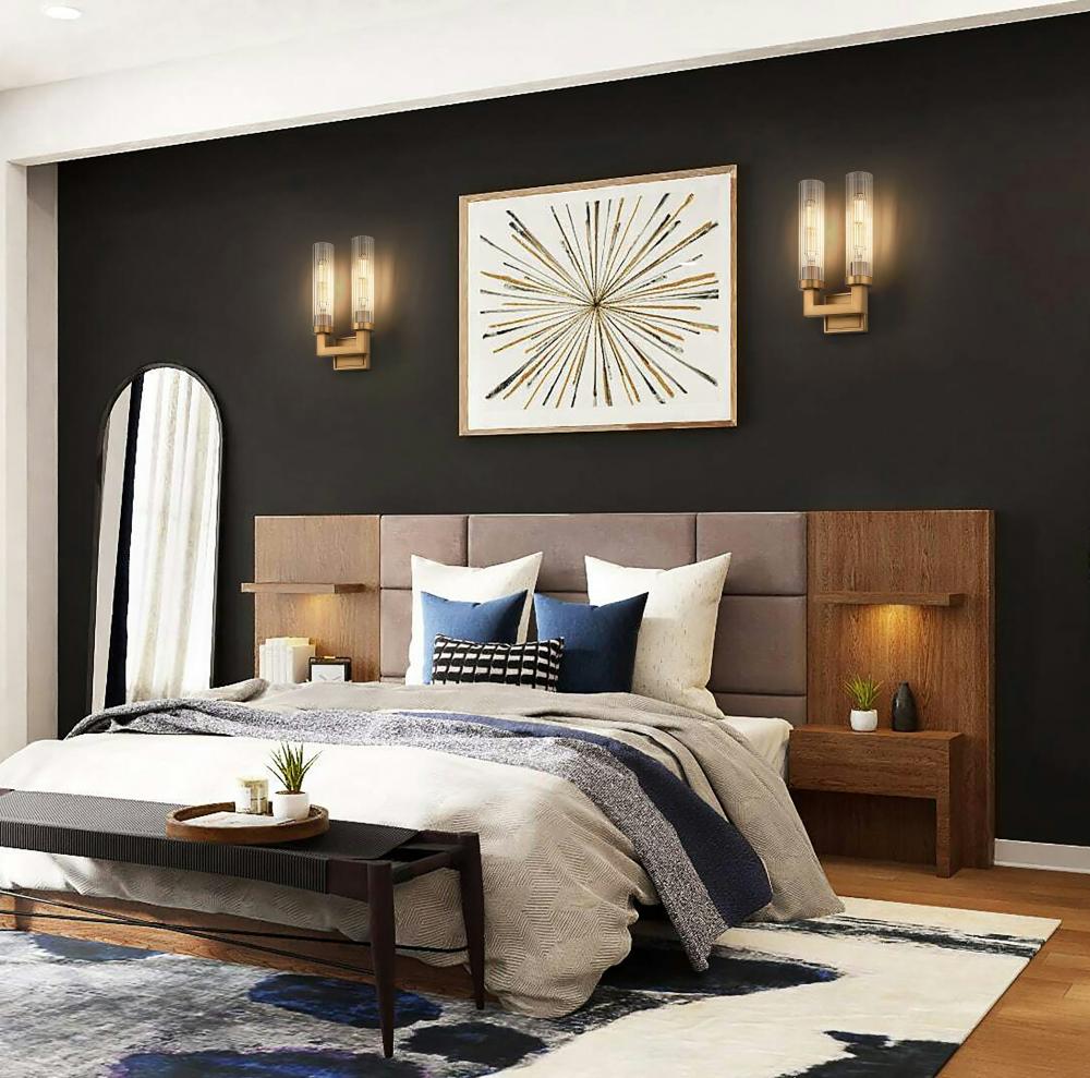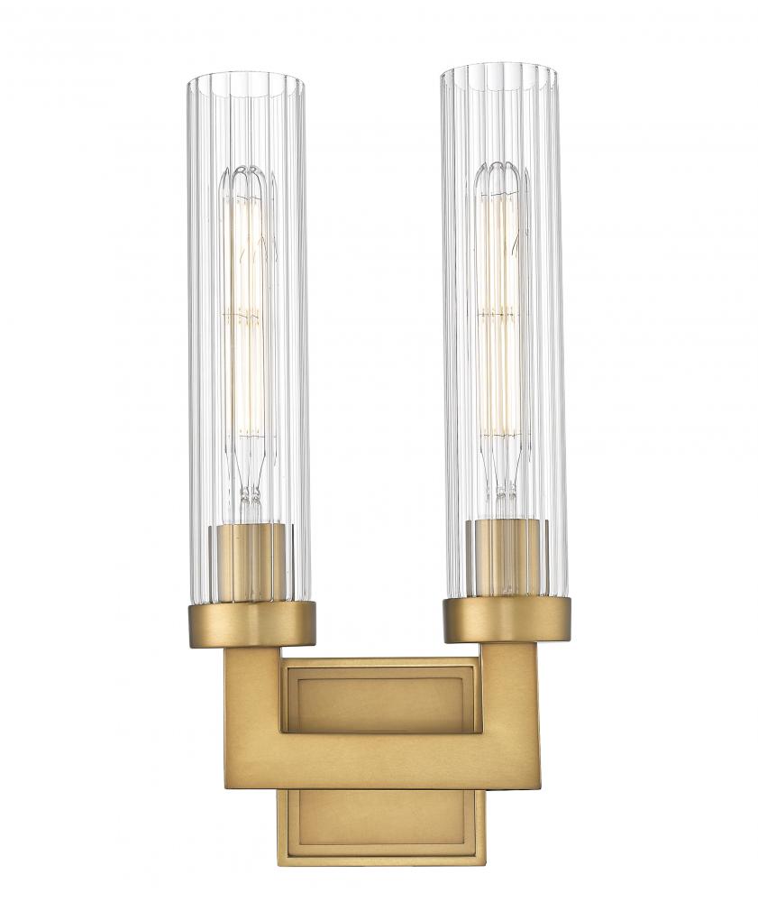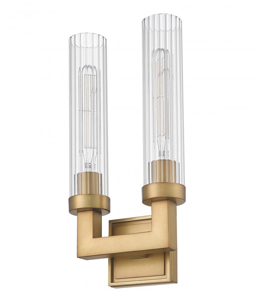 Introduce sophisticated warmth with this modern two-light wall sconce. With a rubbed brass finish, it instills a sense of opulence and character. Clear fluted glass cylinders shade the lights and add the perfect hint of vintage allure.