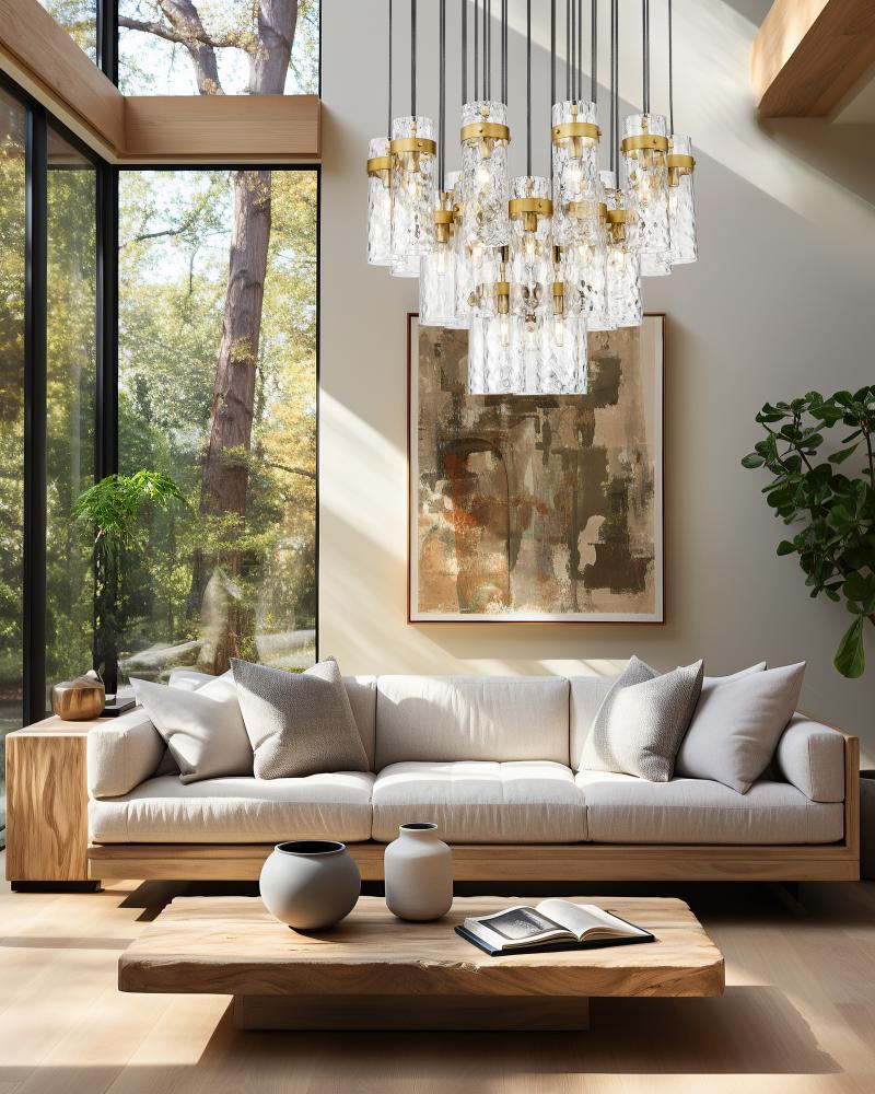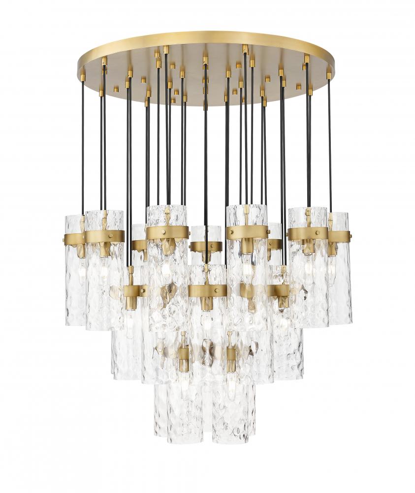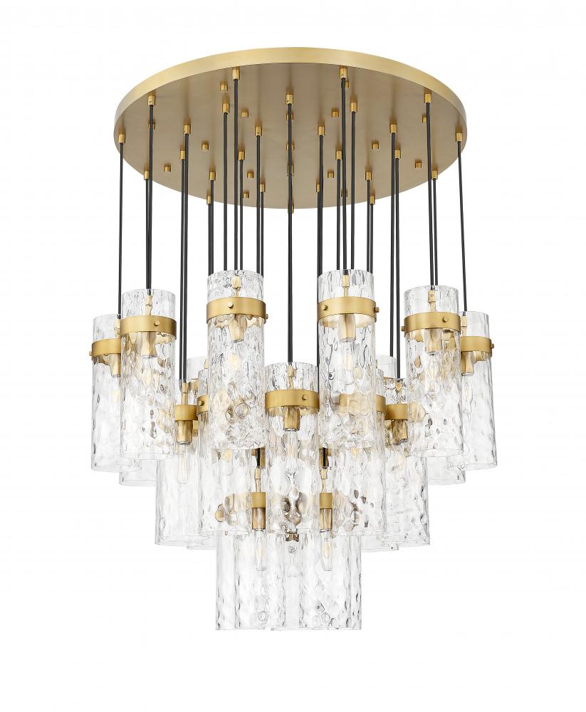 Opulent rubbed brass finishing creates incredible warmth and sophistication for this modern 27-light chandelier. Its round canopy and metal collars contrast beautifully against cylinders of rippling water glass, delivering powerful presentation and elegance.
