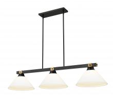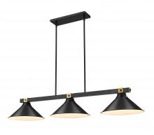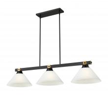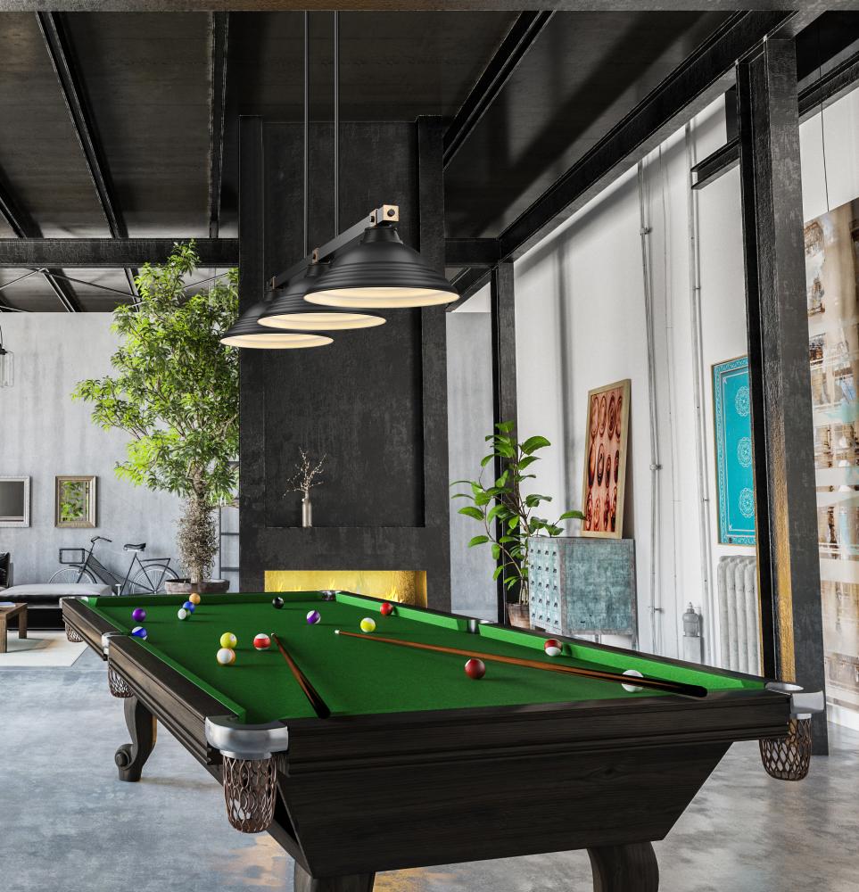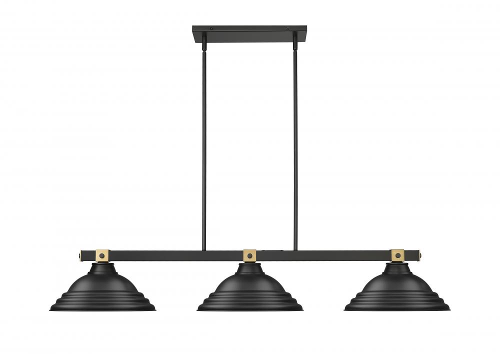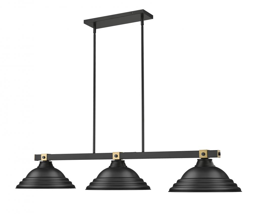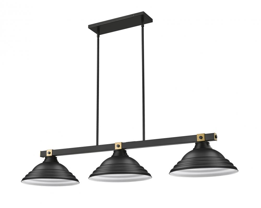 Delicate stepped details add texture and character to this modern three-light billiards pendant. It?s a linear design suited to pool tables and dining rooms, offering fresh style with a simple frame and matte black finish. Shades are embellished with a rubbed brass finish detail and include white interiors for bright lighting.