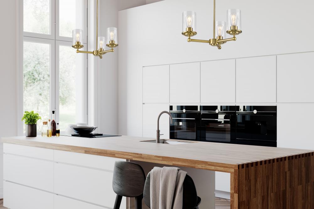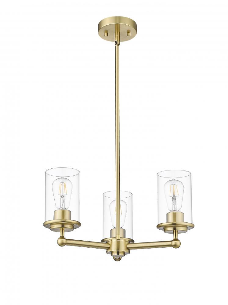 Timeless style elements infuse a sense of character in a modern three-light chandelier. Smooth, clear glass cylinders surround each light, nestled in a metal frame that adds a rich luxe gold finish thats versatile and neutral in any setting. A gorgeous addition over a breakfast nook or even adding a glam touch in your dressing area.