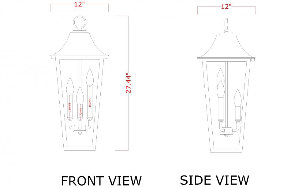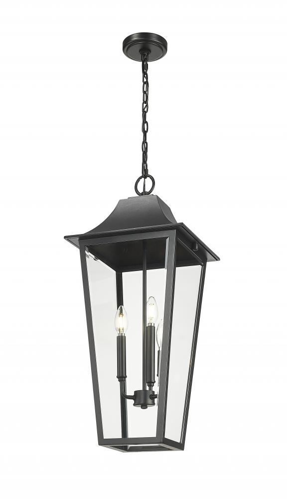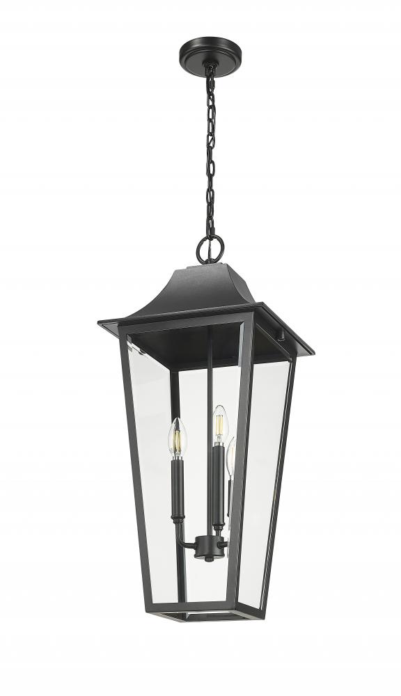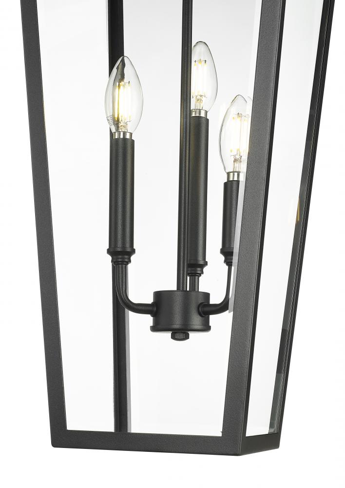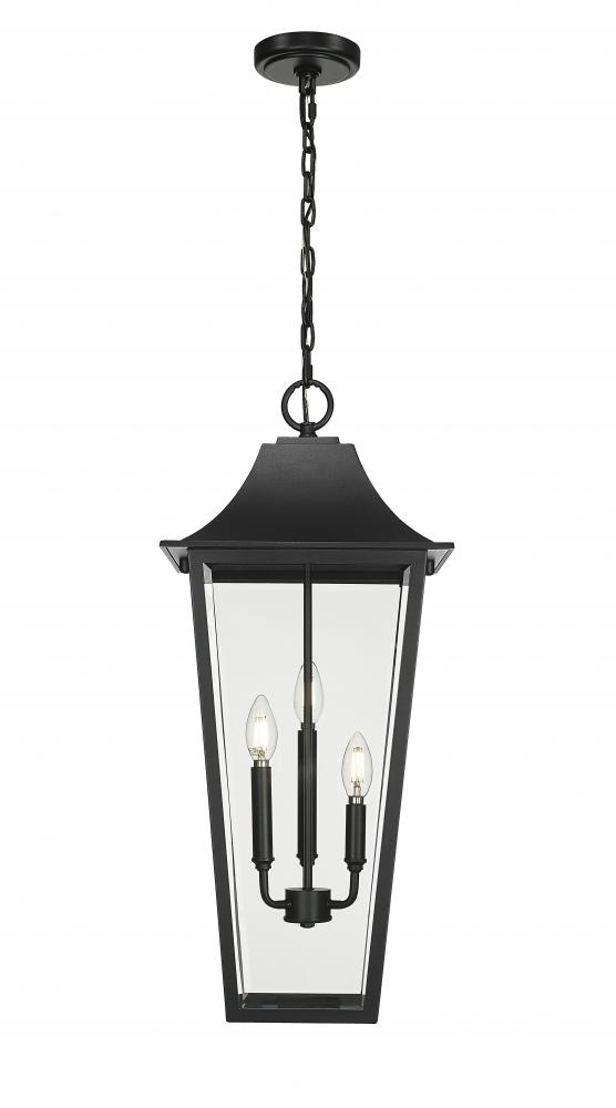 Coastal black finishing augments the timeless lantern silhouette of a traditional three-light outdoor hanging light. Perfect over a front entry, it offers an elongated silhouette with a central light cluster that offers bright illumination to your front entry or outdoor living space.