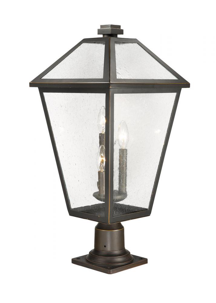 Illuminate an exterior front or back walkway with a classic fixture reflecting a charming village theme. Made from Rubbed Bronze metal and seedy glass panels, this three-light outdoor pier mounted fixture delivers a charming upgrade with industrial-inspired attitude and a cage silhouette thats perfect for lower-level gardens and walkways.
