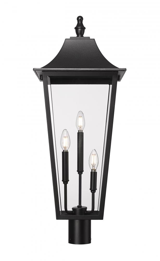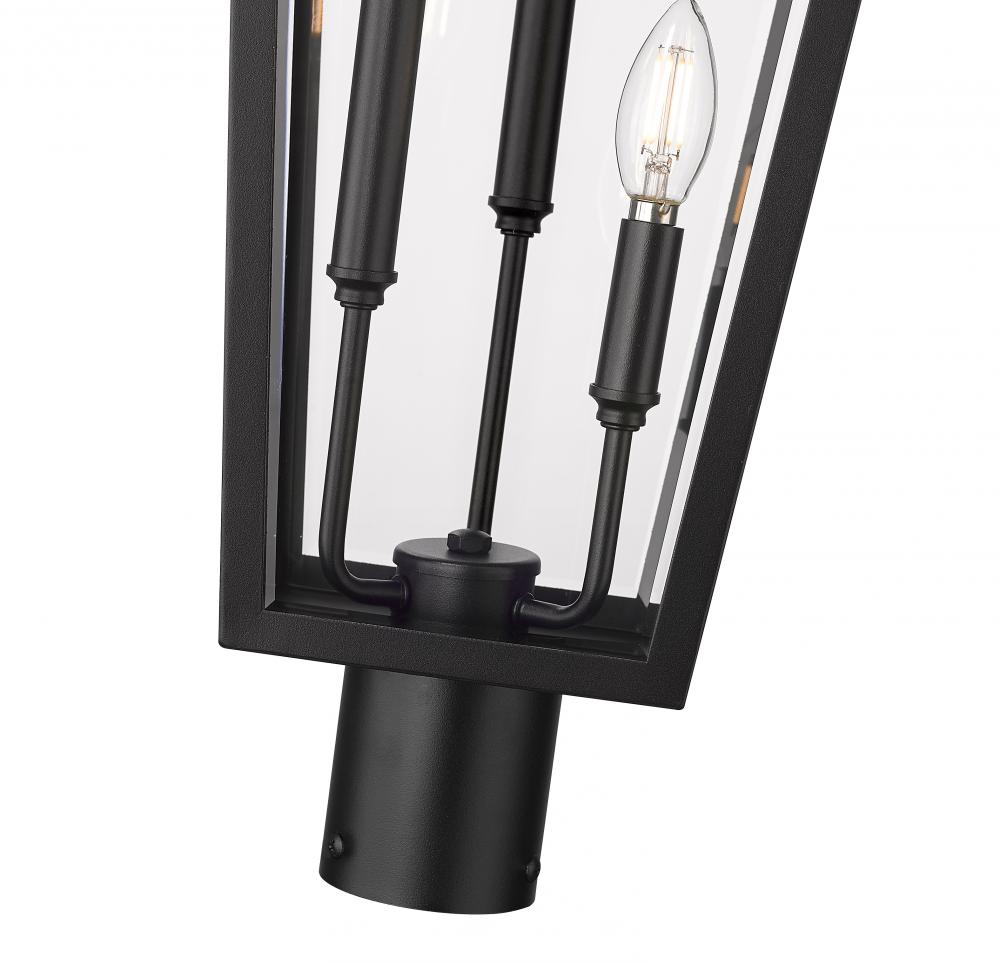 A gracefully sloped top and tapering glass panes create a refined silhouette for this traditional three-light outdoor post mount lantern. Its classic elegance is highlighted with a stainless steel frame and durable Coastal black finish. Clear beveled glass delivers excellent illumination, perfect for a front porch or backyard deck.