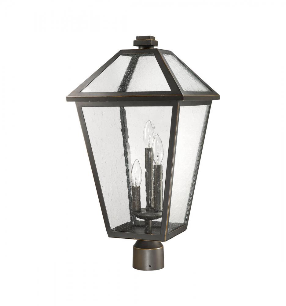 Bring welcomed light to an exterior front or back walkway with a classic fixture reflecting a charming village theme. Made from Rubbed Bronze finish metal and seedy glass panels, this three-light outdoor post mount fixture delivers a fresh upgrade with a round post mount and an industrial-inspired attitude.