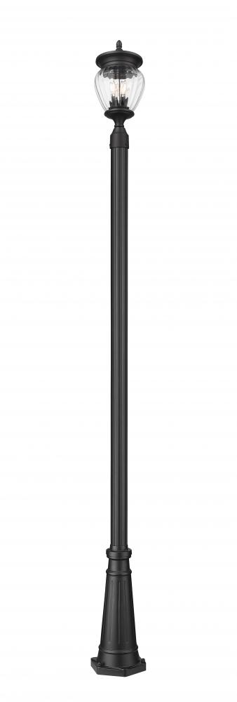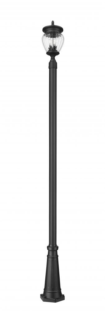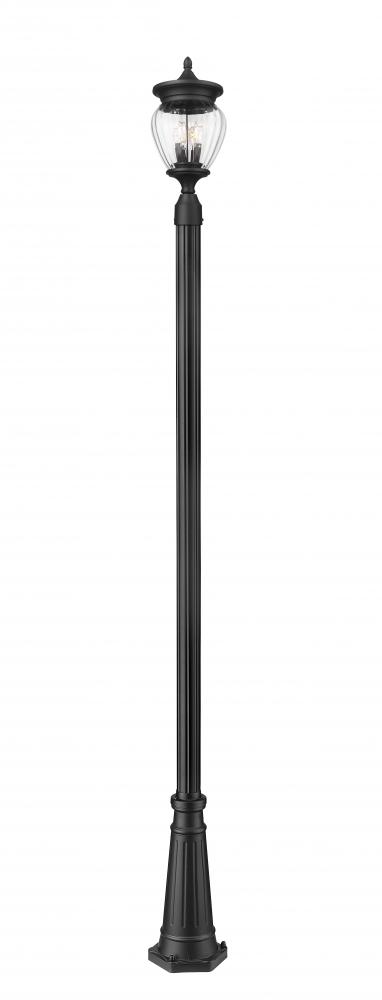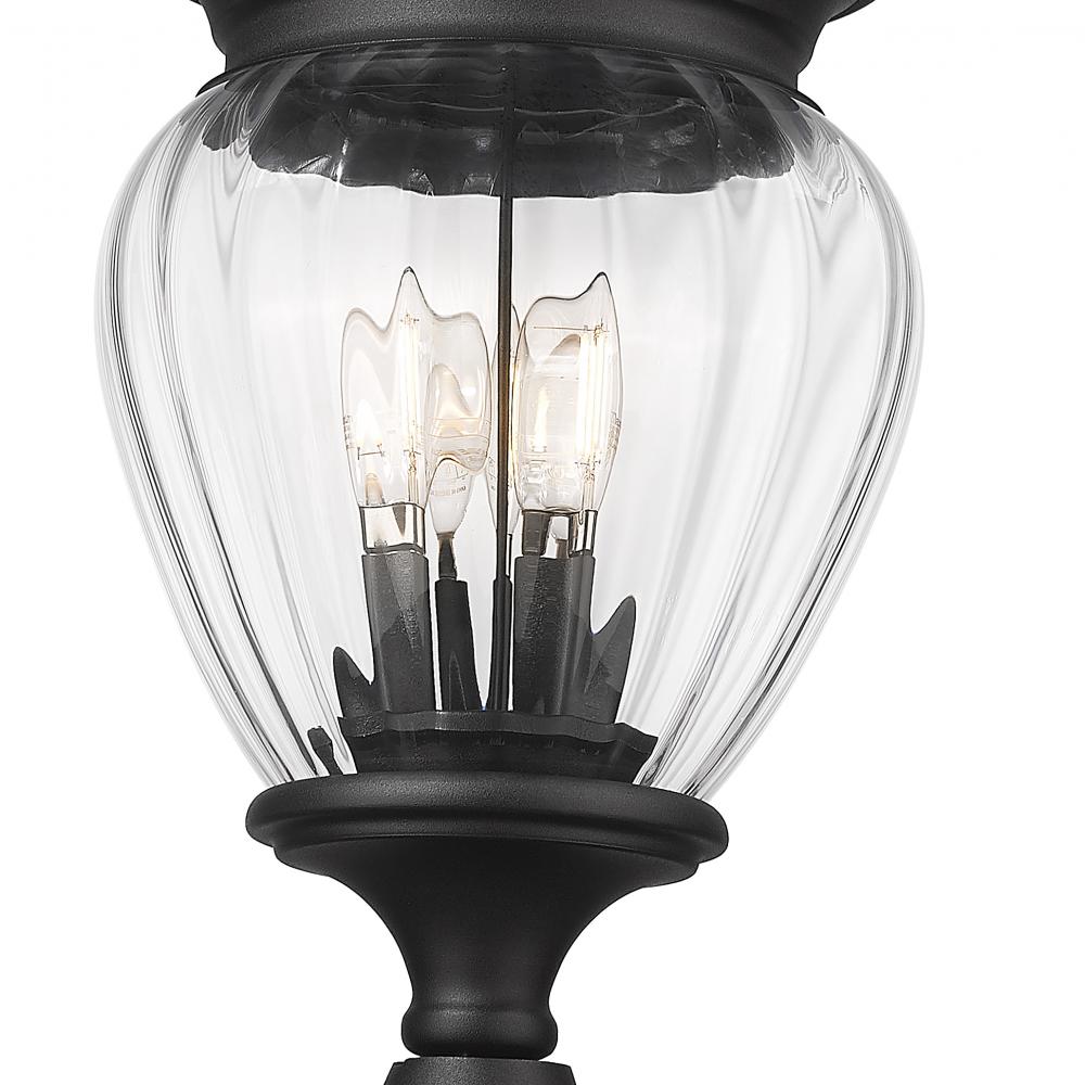 This glam-inspired three-light outdoor post-mounted fixture elevates a front or back yard in perfect style. Wonderful for delivering an alluring look with dimmable lighting in gardens and along walkways, this slender fixture is a chic design featuring an aluminum post and light frame with a Coastal black paint finish over aluminum. Ribbed teardrop glass pairs with a candelabra bulb mount to create an intricate silhouette complemented with a tapered post design.