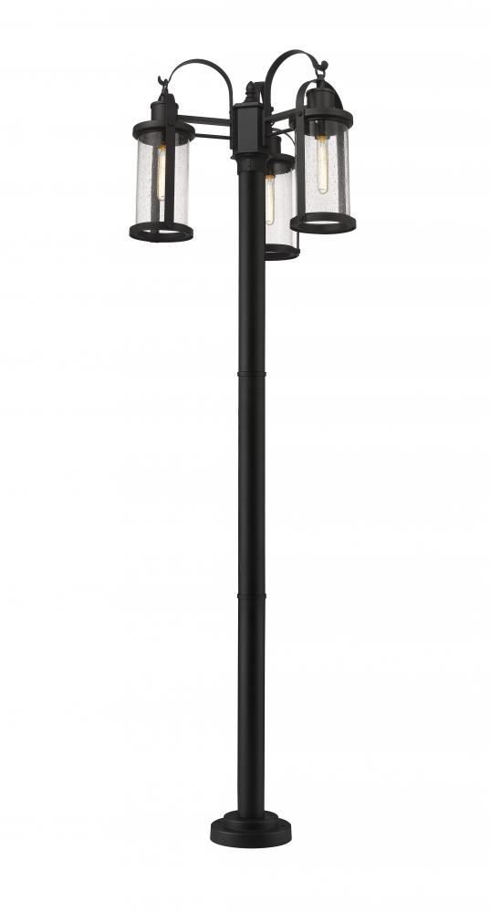 This three-light outdoor post mounted fixture can revitalize the look of your porch or patio space with its lantern-like features and classic yet modern character. Black aluminum composes the elegant, subtly flared post with its circular base, and caps the top and bottom of the two cylindrical shades, finished with clear seedy glass. LED bulbs effectively illuminate your space, making this a clear choice for sleek, energy-efficient exterior lighting.